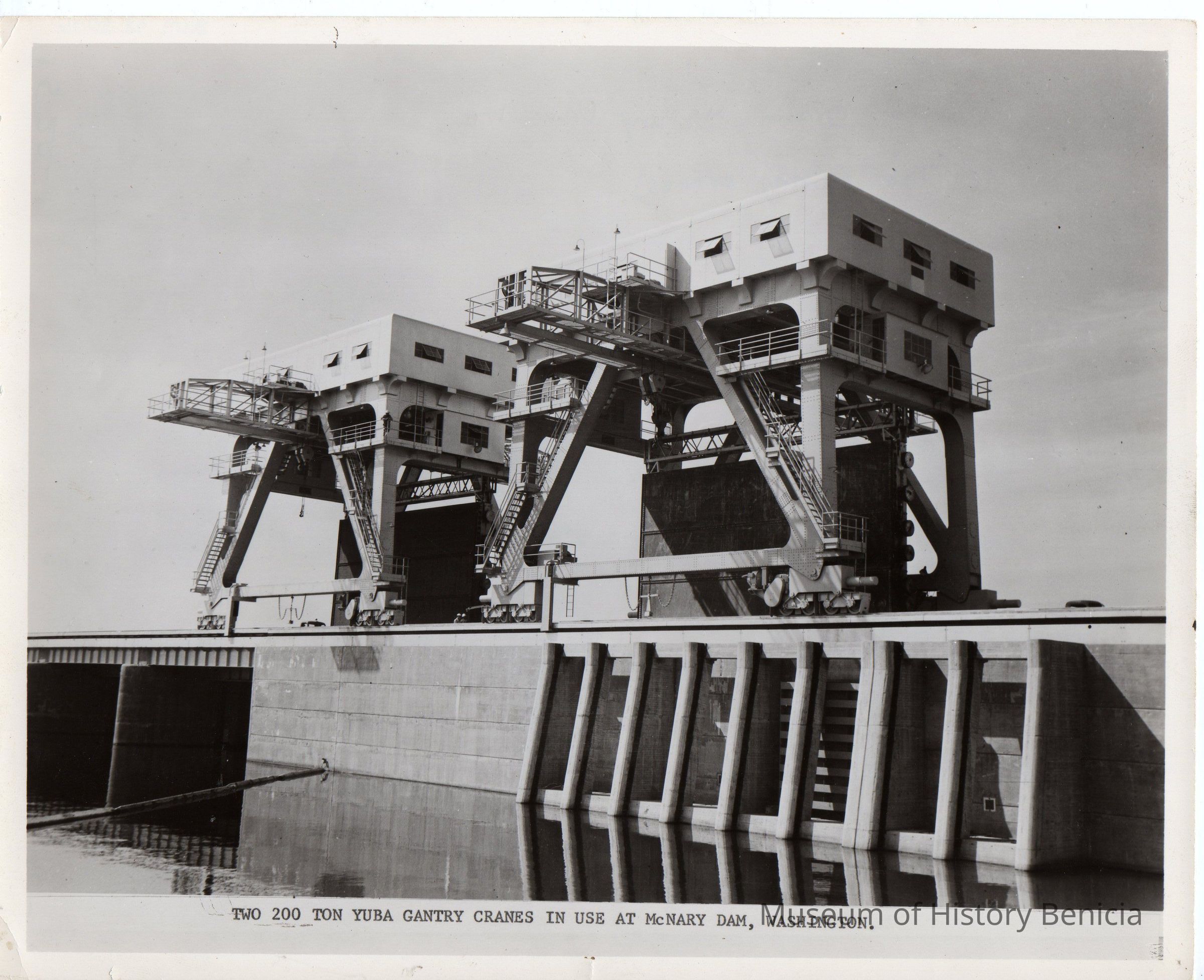 Two 200-ton Gantry cranes in use at McNary Dam, WA. B/W photo.