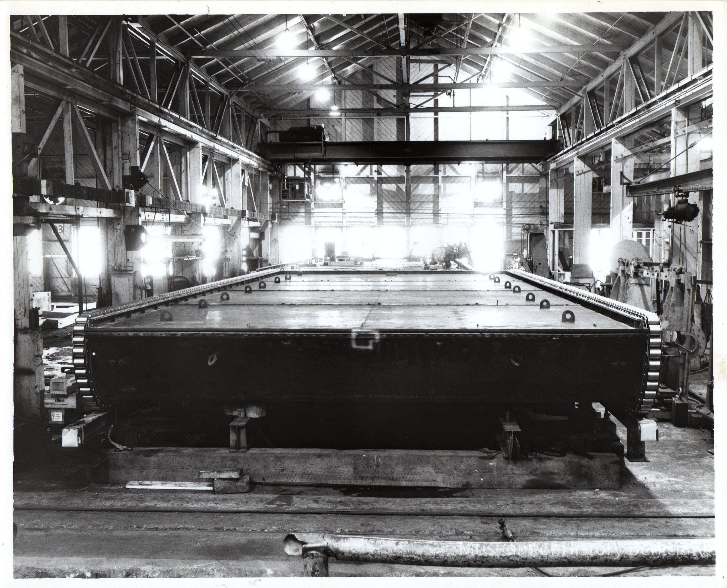 Black and white photo of roller-type rigid dam gates.