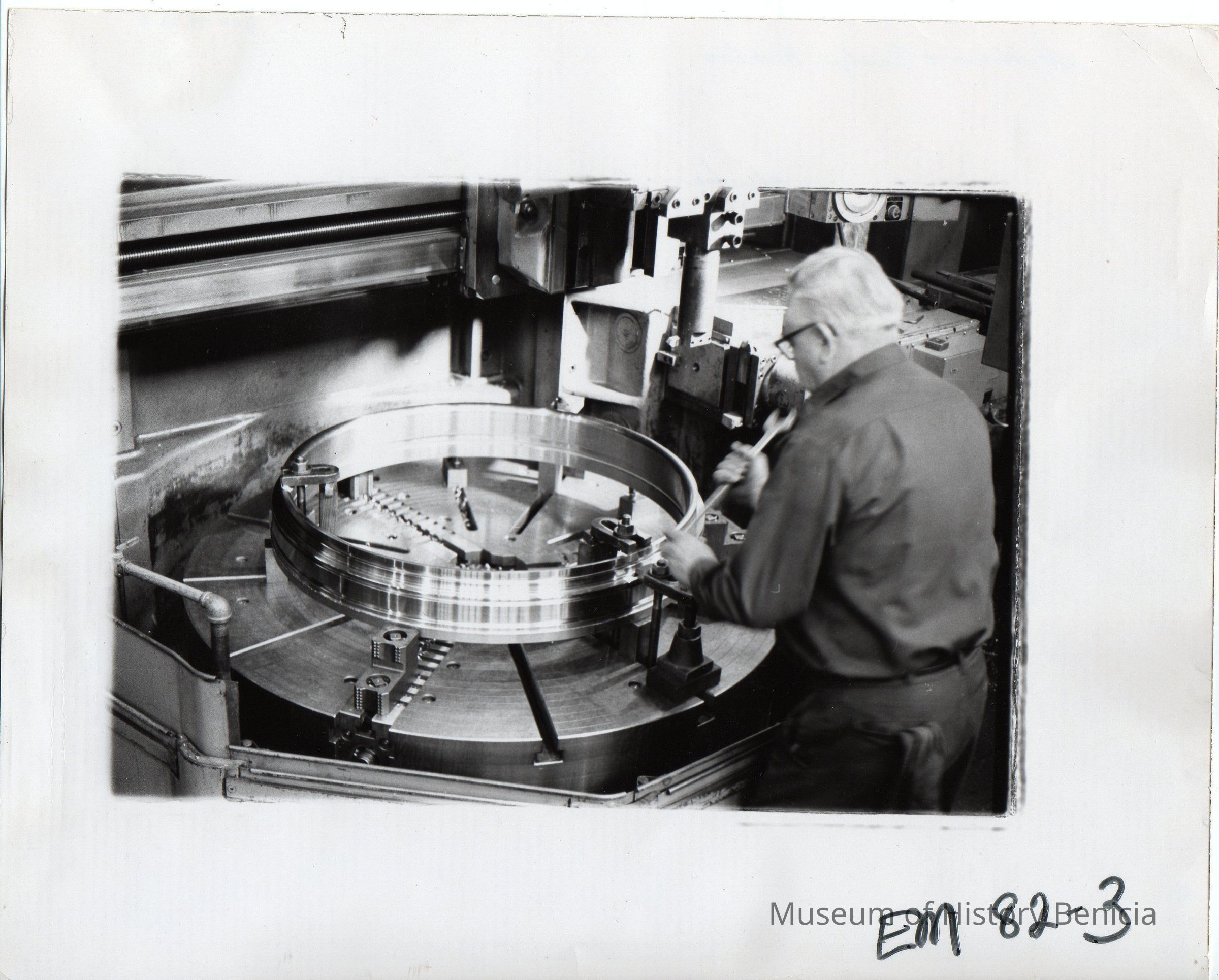 Black and white photo of William Porter adjusting a milling machine at the Yuba Mfg. plant.