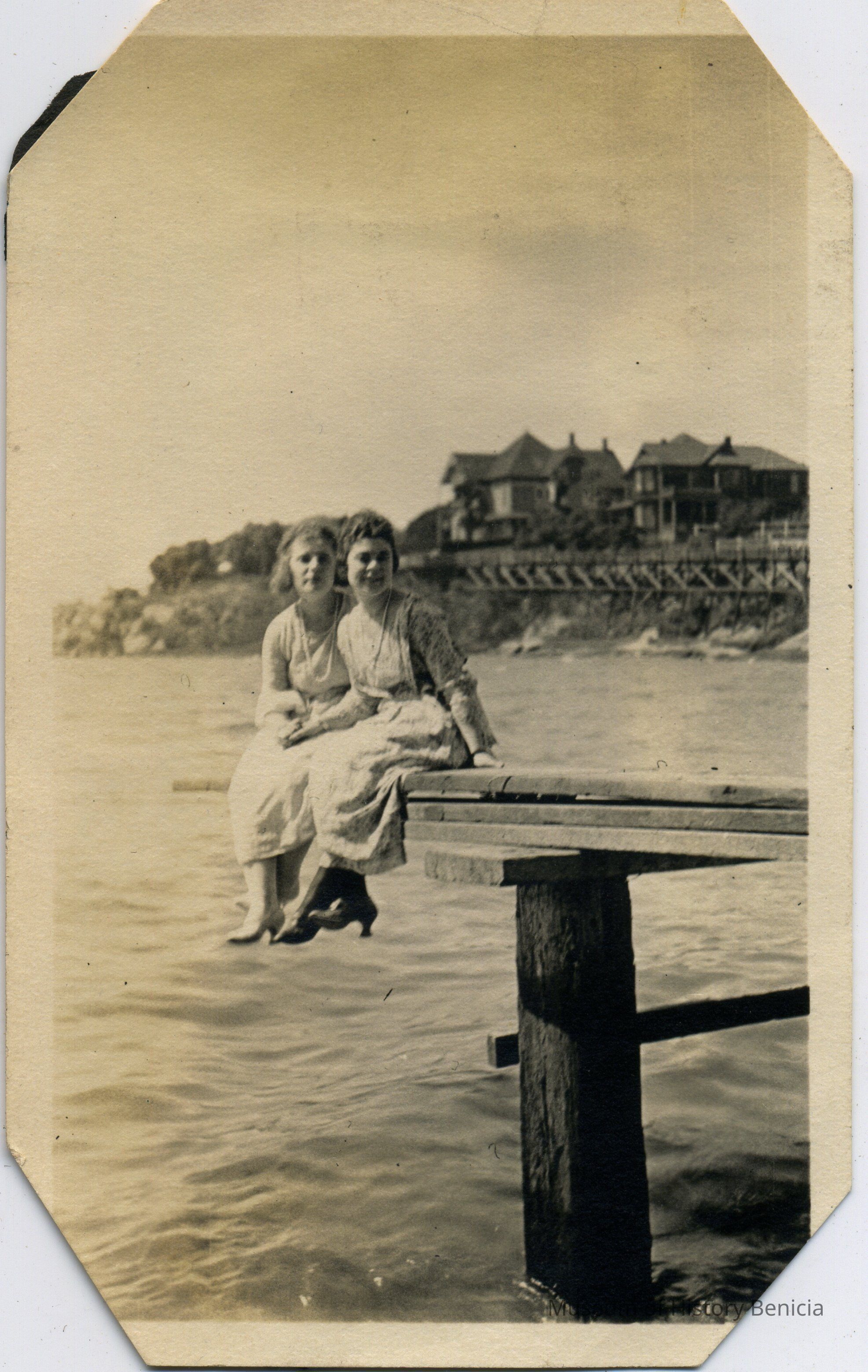 Ruth Williams Alexander and unidentified girls sitting on the dock at the Anderson Hotel. The Crooks house is in the background. B/W photo.Collection