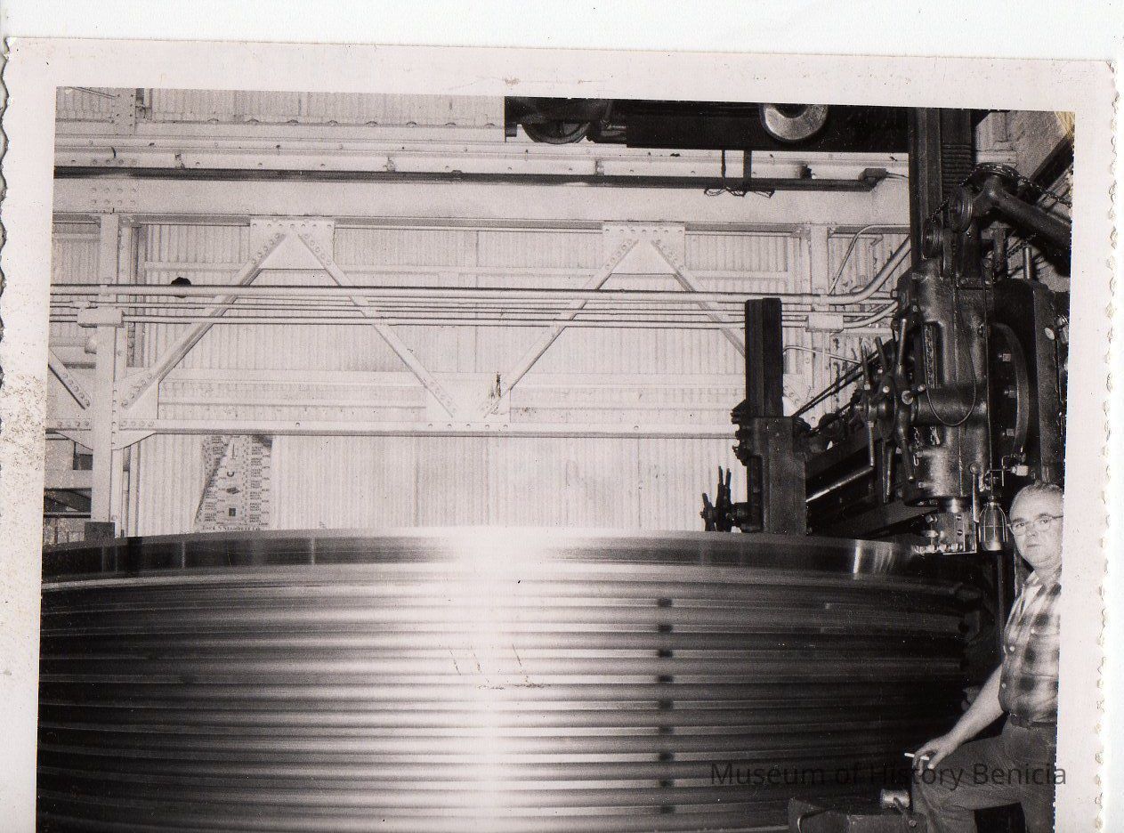 Large shiv in milling machine with William Porter at right. Built for Ohio River Bridge. Black and white photo.