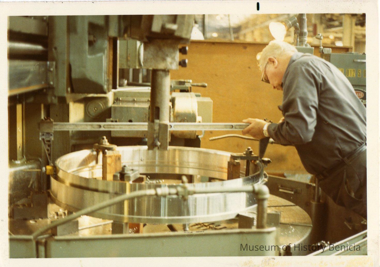 Color photograph of Yuba machinist William Porter adjusting a milling machine. William Porter was a precision machinist at Yuba Mfg. Co. Taped to bottom right corner: "1/2/70 EM 8.1-2".Collection