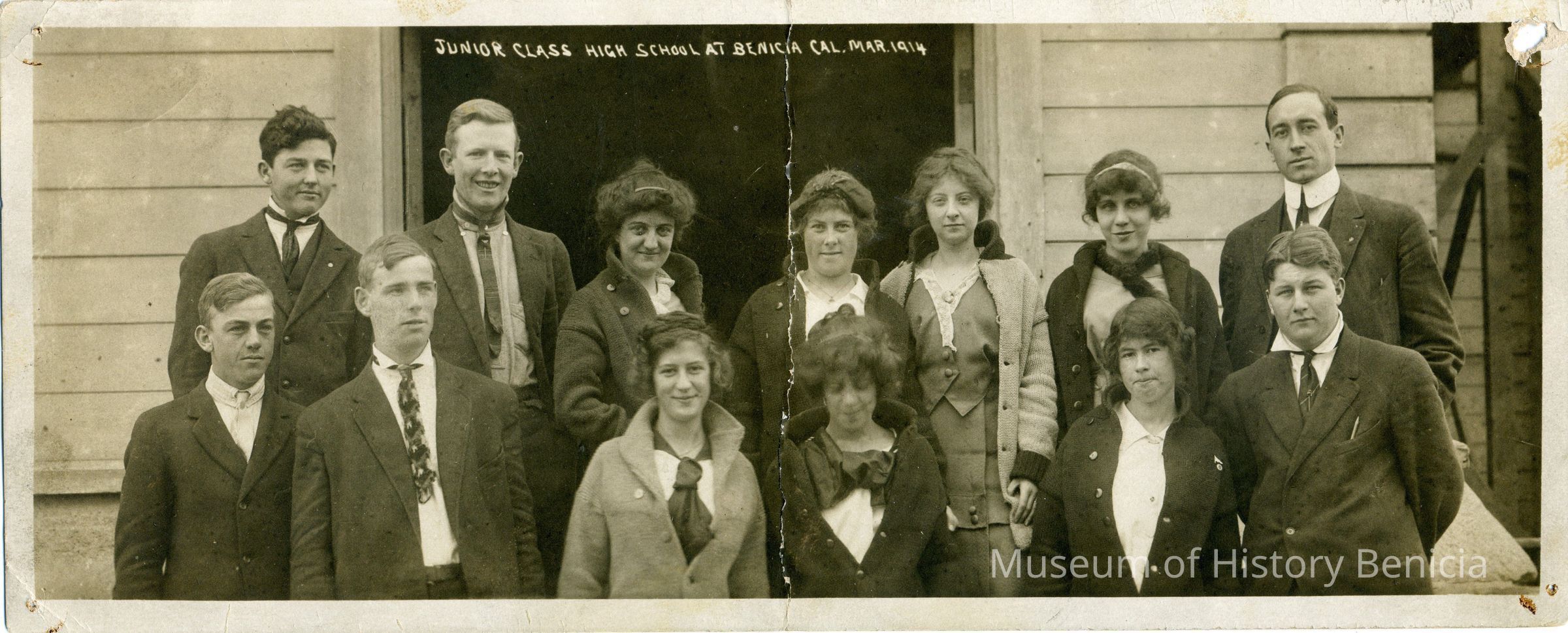 Junior Class, High School at Benicia, CA, March 1914. One male teacher, 5 boys, 7 girls standing astride wooden building.