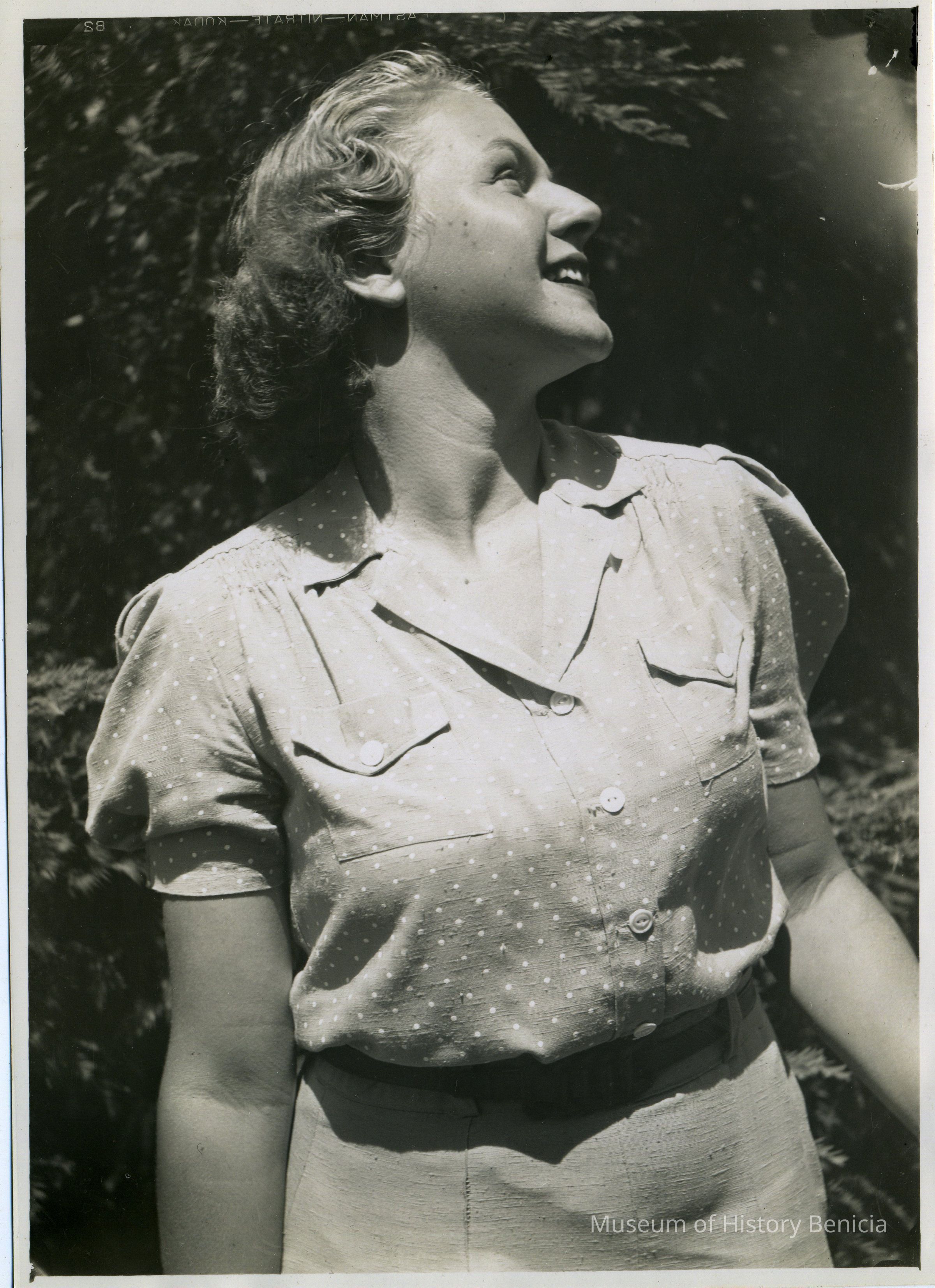 B/W photo of woman in P611 and P612, close-up side view of woman wearing polka-dot blouse, solid-color skirt.Collection