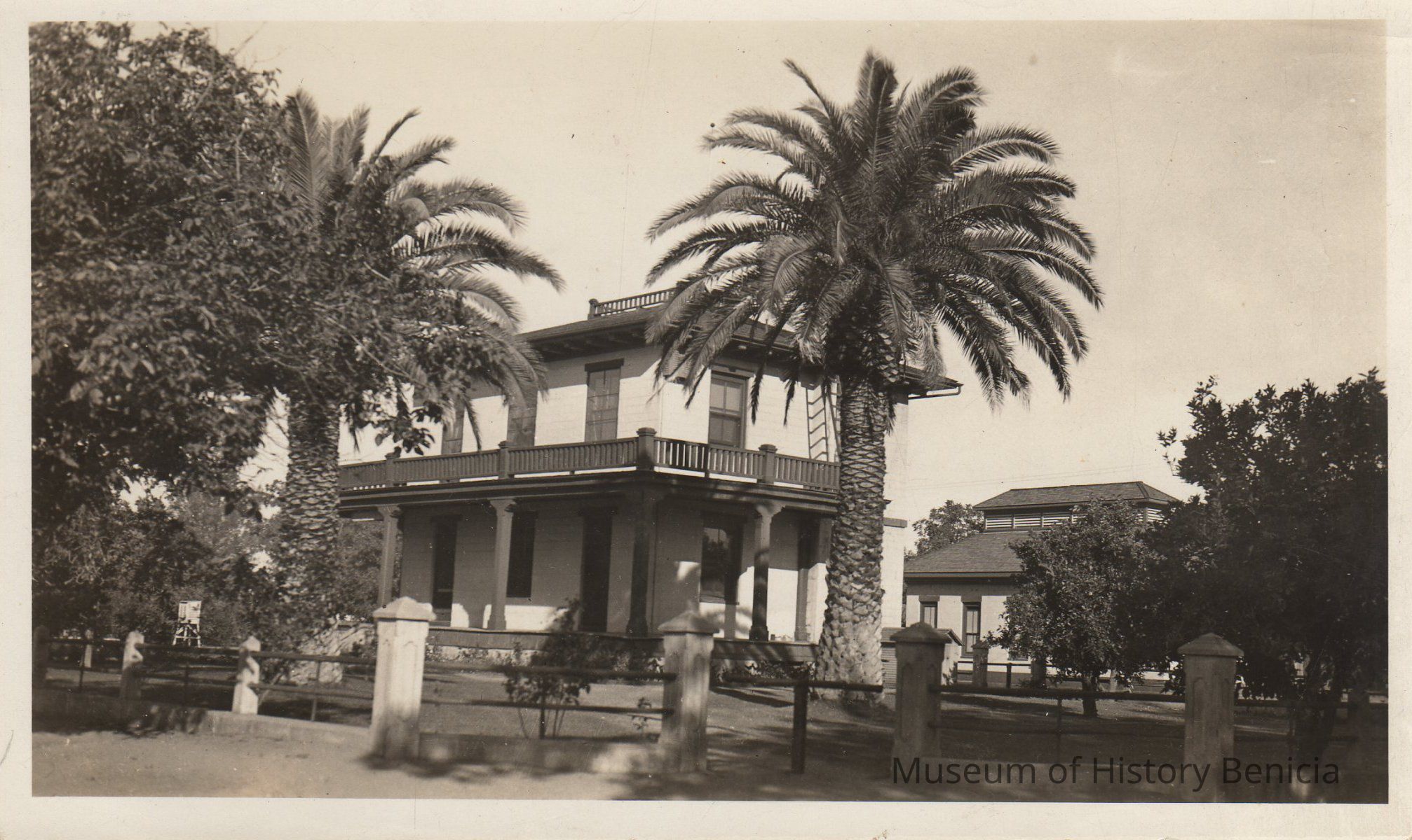 B/W photo of office Hammonton, 1935 (Yuba Consolidated Fields). The photo shows building in center with palm trees on either side.