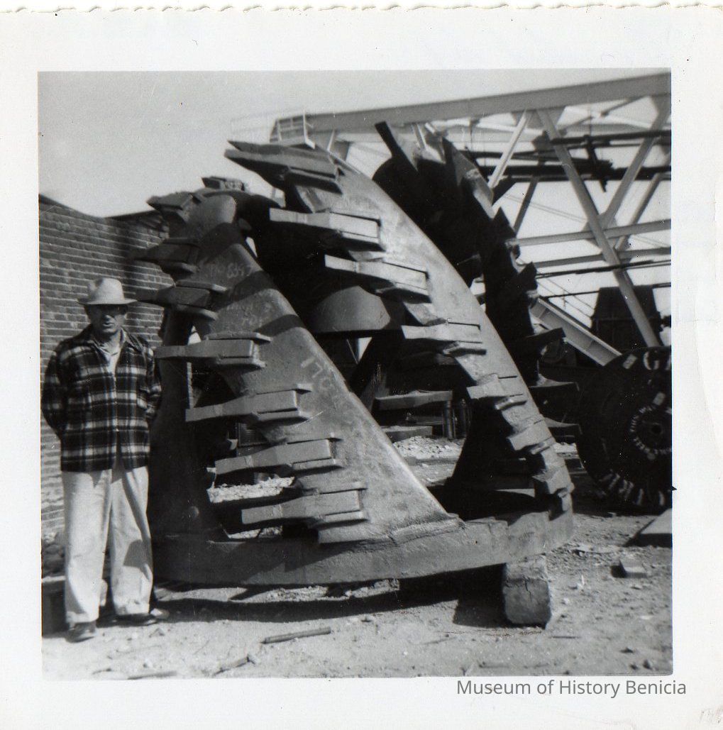 Auger bit at Benicia Yuba plant. Auger bit used to drill into mud or sand and loosened material is then sucked into large hoses and material transported to land. B/W photo.Collection