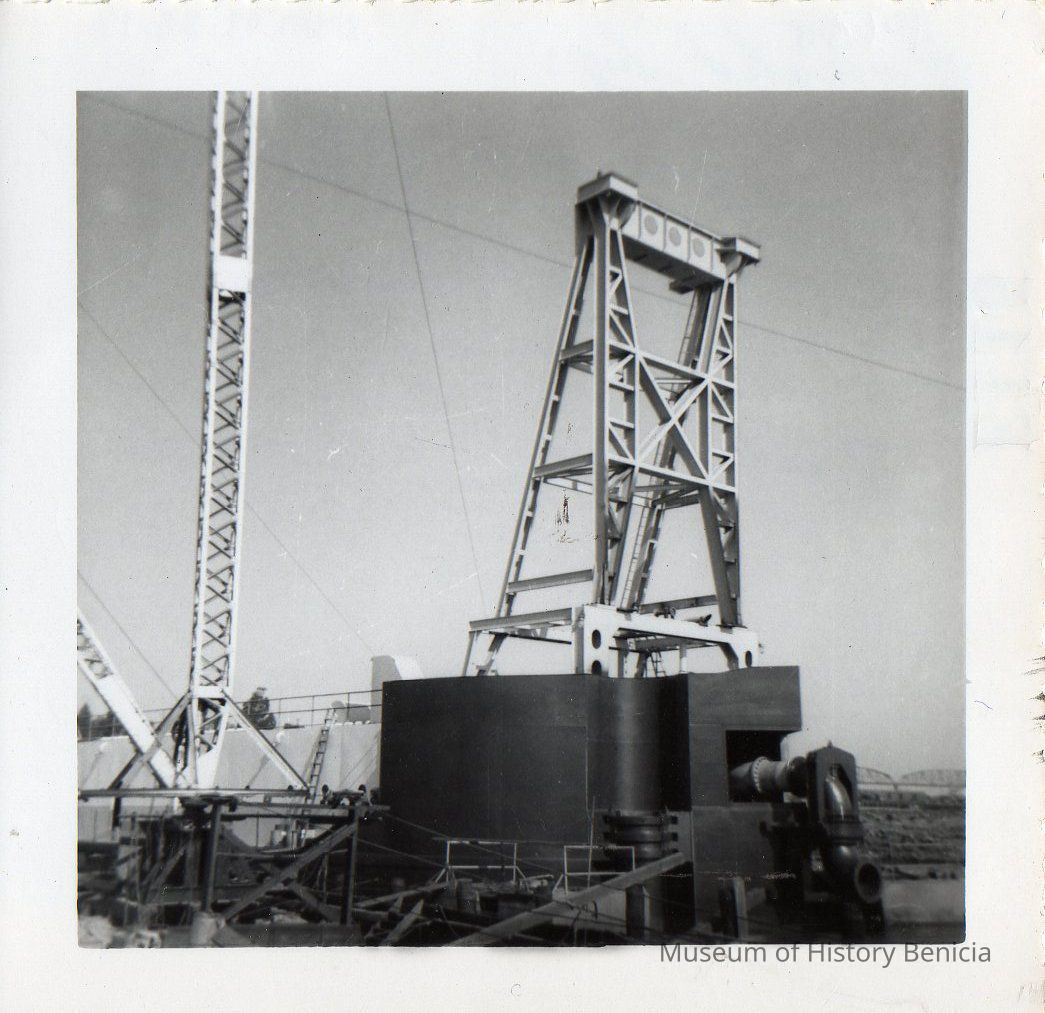 Derrick at Yuba plant lifts support structure for the "spuds". "Spuds" were lowered into the bottom of the bay to hold the dredger in place. Black and white photo.Collection