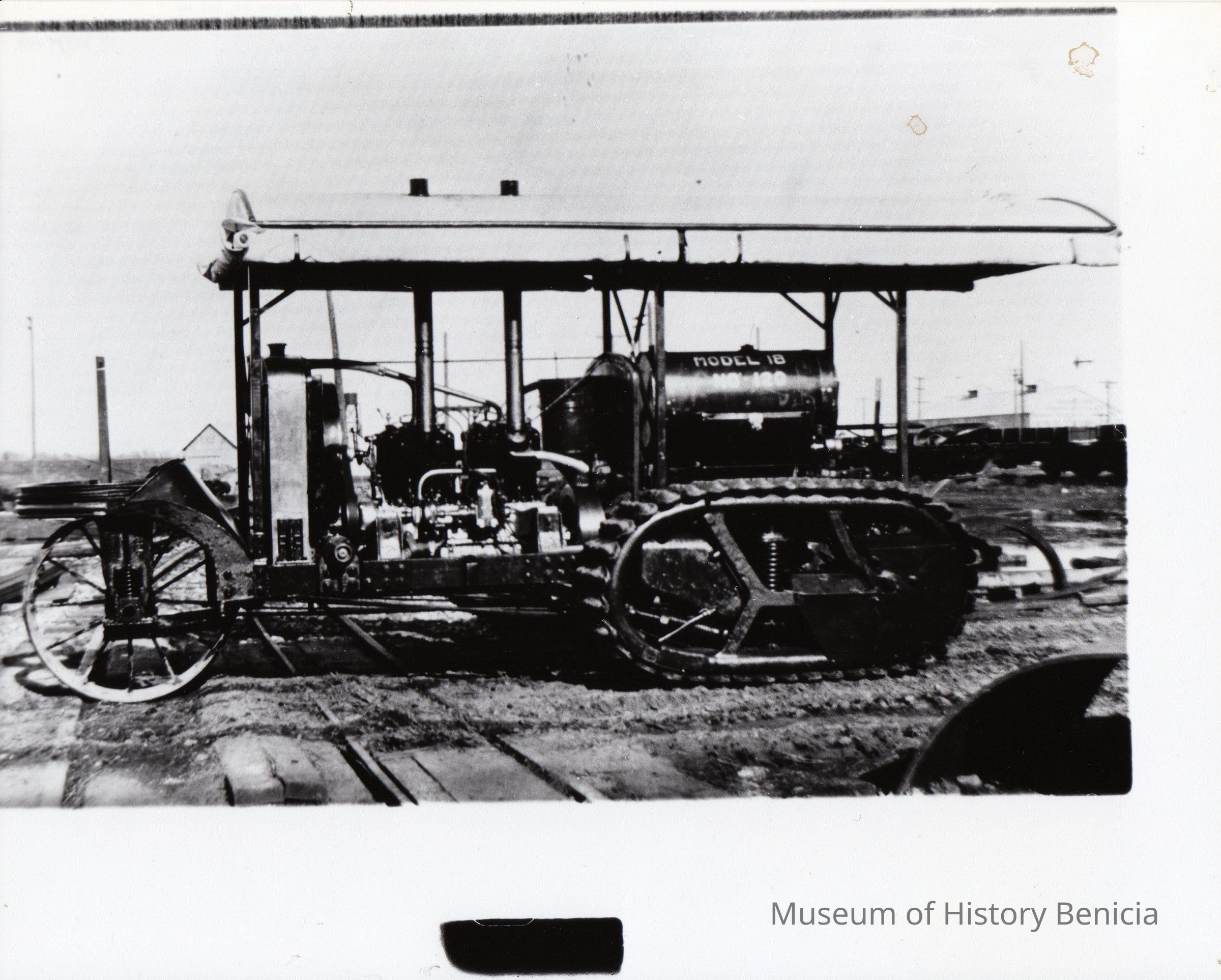 Yuba Mfg. Co., Marysville, CA. Model 18 the Yuba tractor treads moved around ball bearing race. 20 HP Wakasha Gas Engine 1914-1926. Black and white photo.Collection