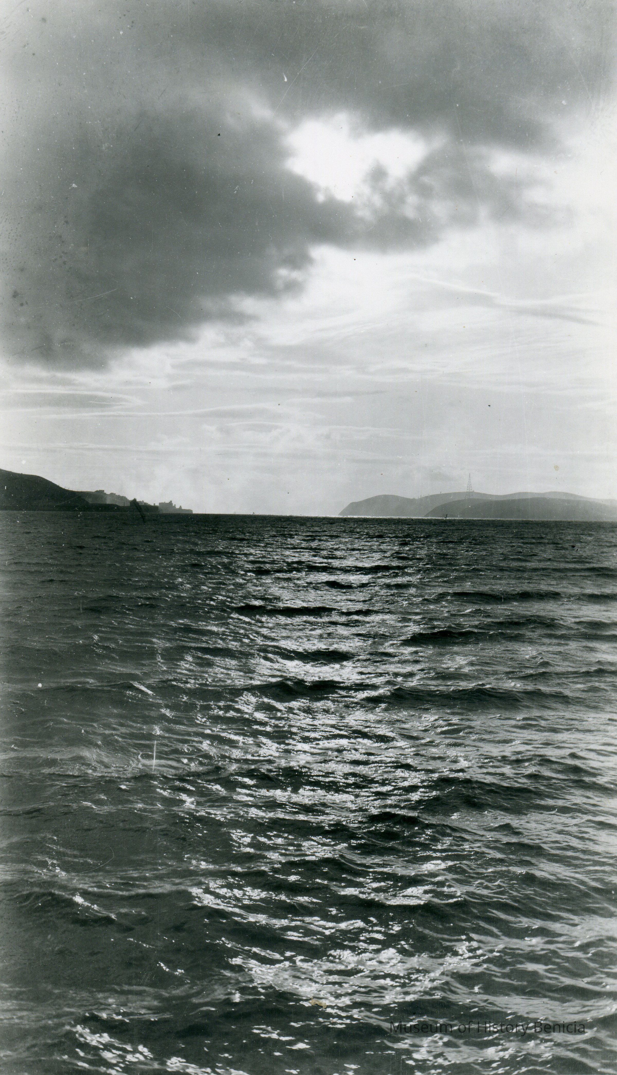 B/W photograph on the Carquinez Strait off Benicia looking west before the first bridge was built.