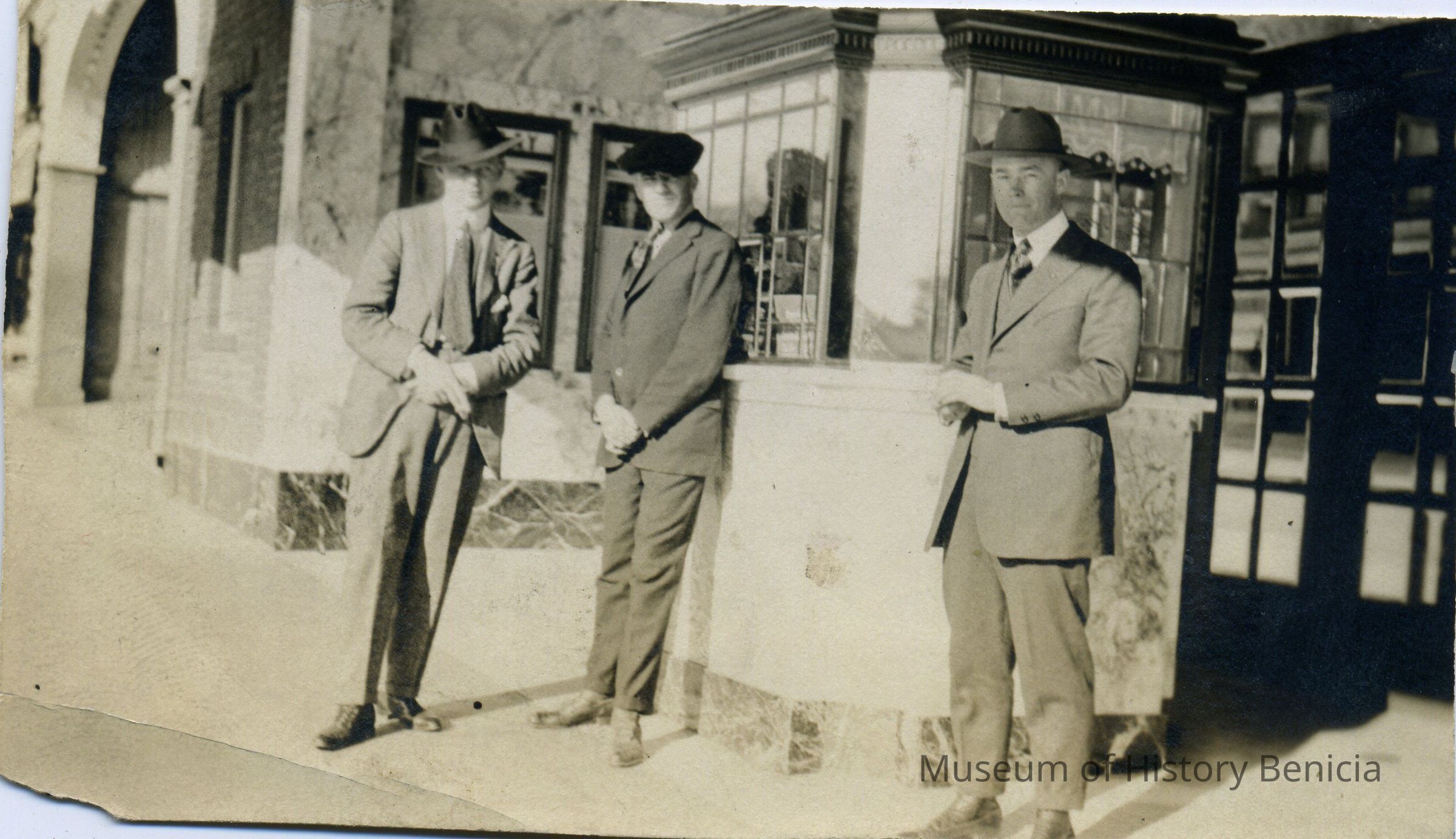 Three men posing in front of the Majestic Theatre box office-- men are not identified. Circa 1920's. B/W photo.
