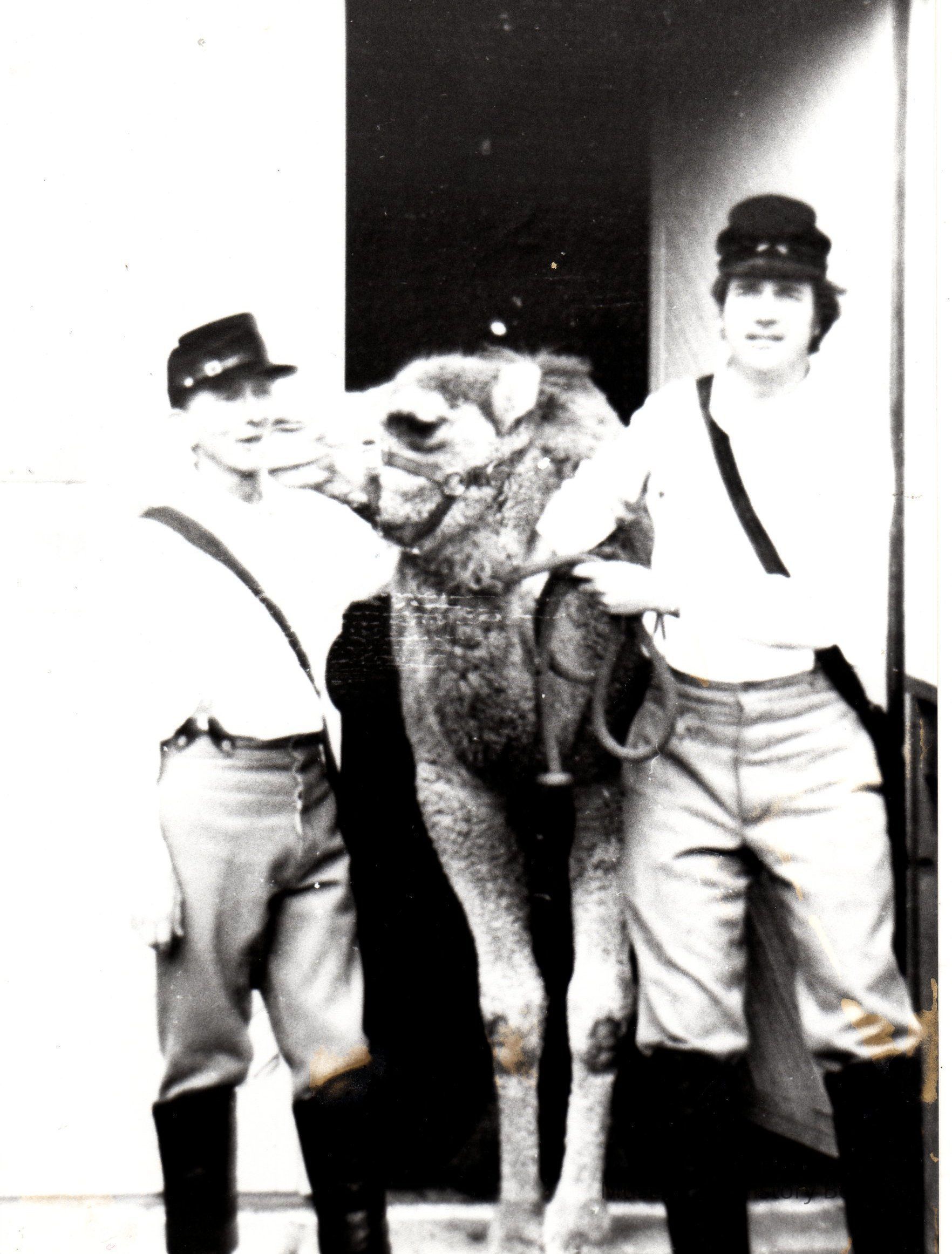 Cropped close-up of P1517 - Camel named "Atar" visits the Camel Barn Museum. Civil War buffs Larry Rogers (left) and David Stevens (right) are in uniform. 1989 B/W photoCollection