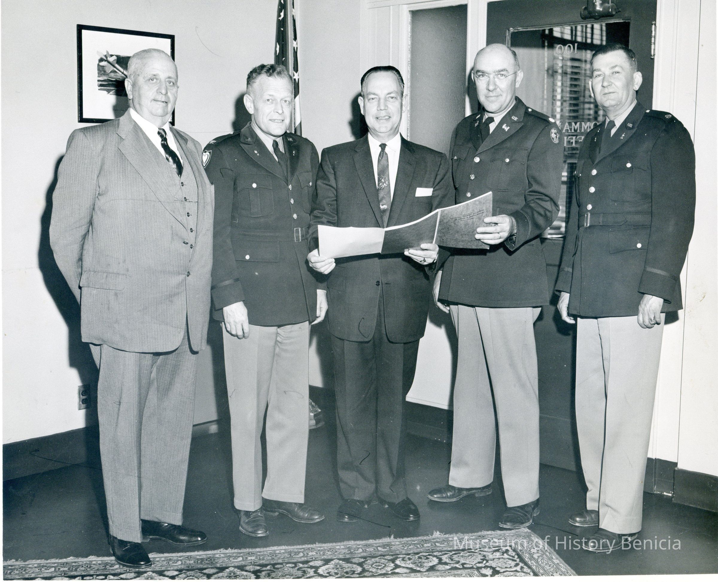 Group of five individuals, believed to be Civil Defense Group. From left to right: Mayor Tom Wright, Army officer, unknown civilian, Army officer, Army officer (only Mr. Wright has been identified at this time). B/W glossy photo.Collection