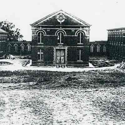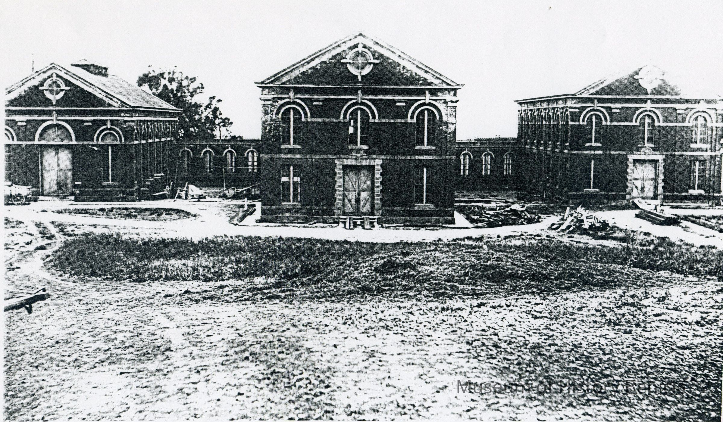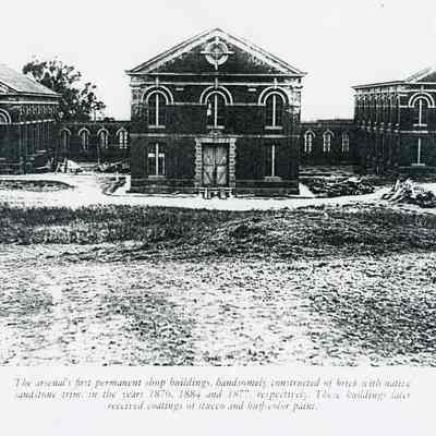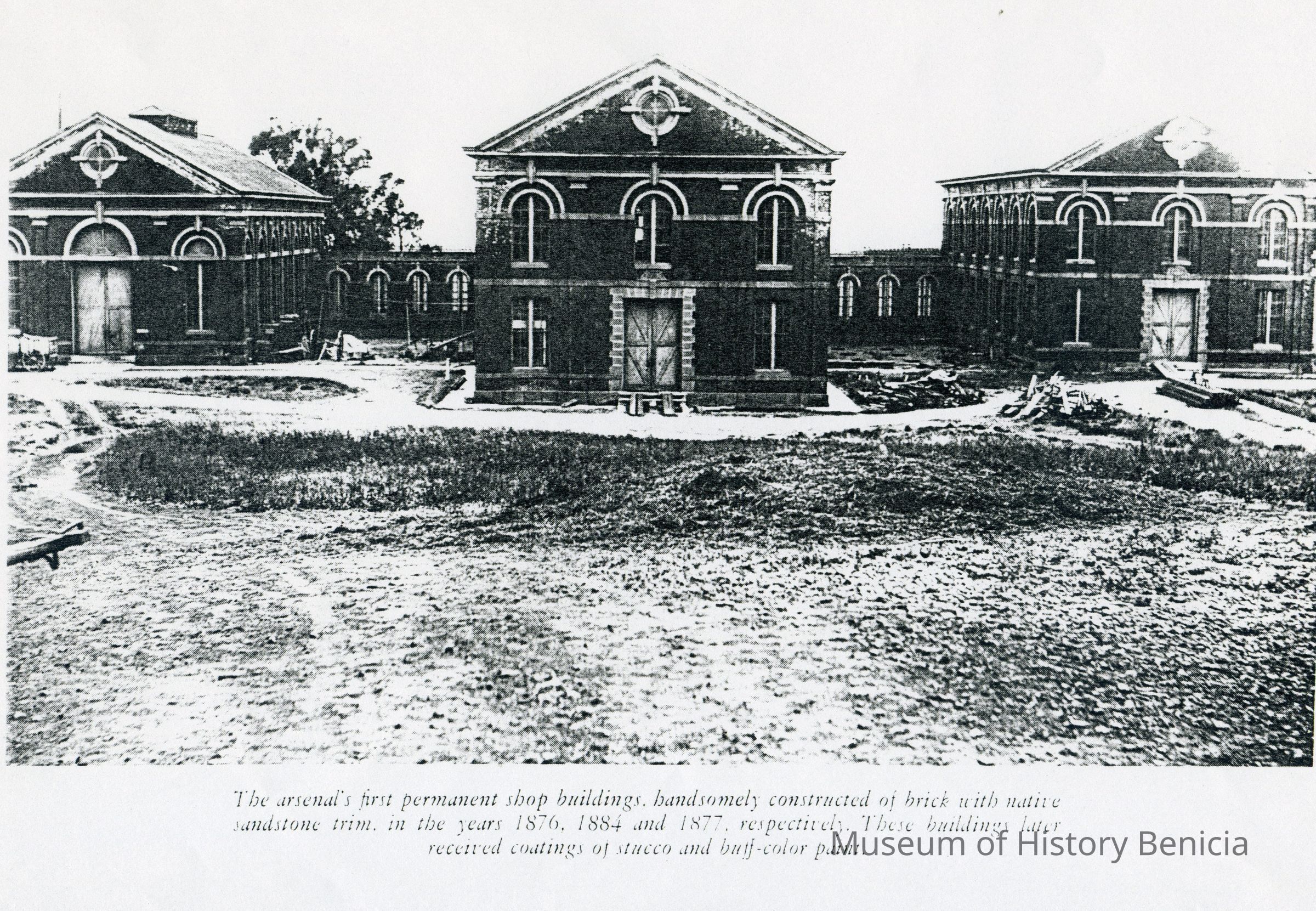 B/W photocopy of an original photograph located at the Benicia Arsenal: "The arsenal's first permanent shop buildings, handsomely constructed of brick with native sandstone trim, in the years 1876, 1884 and 1877, respectively. These buildings later received castings of stucco and buff-color paint.Collection