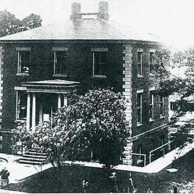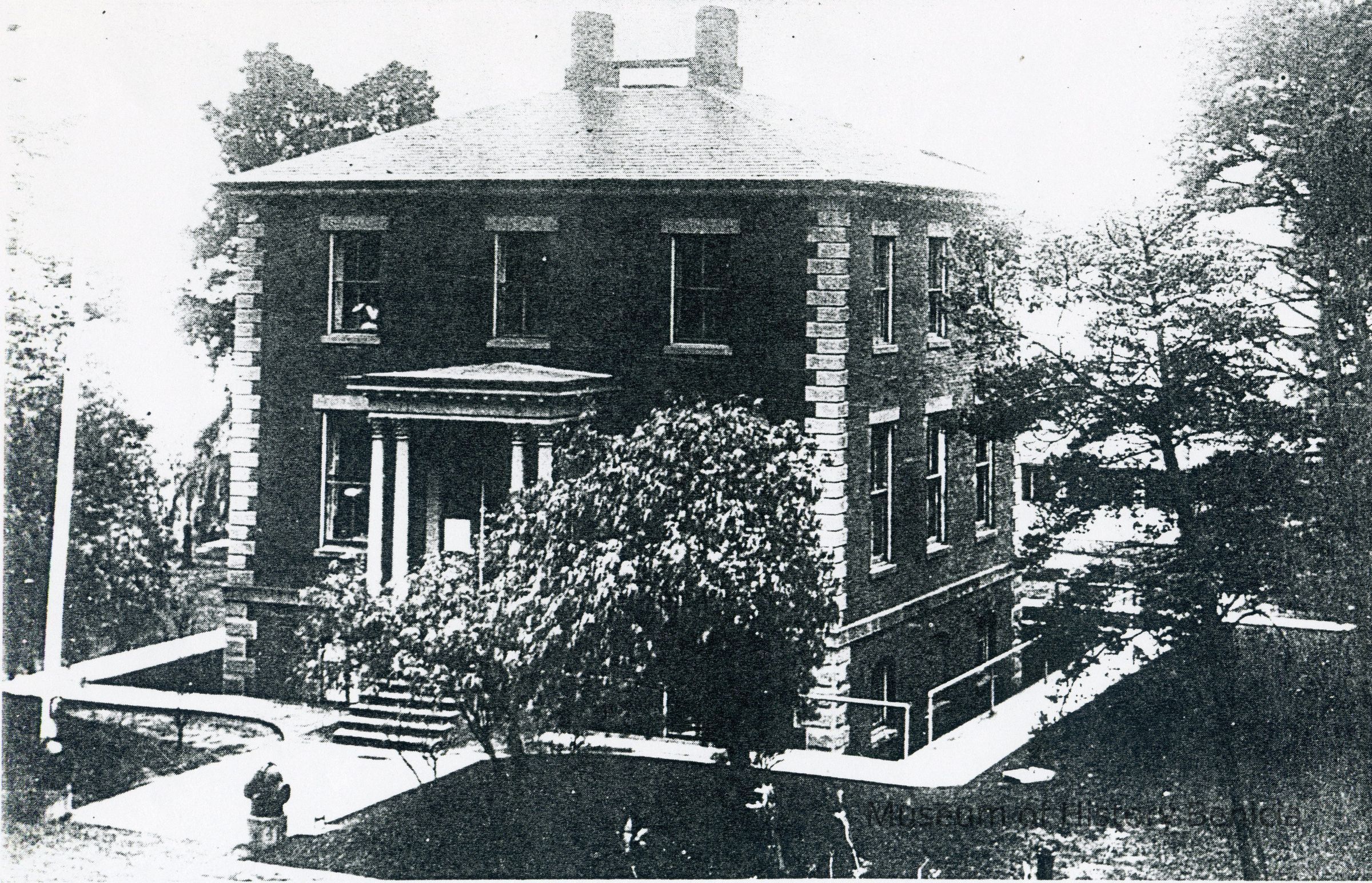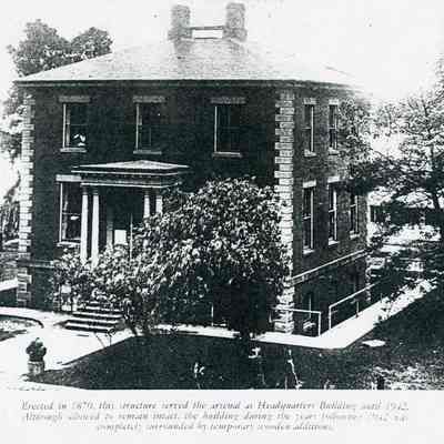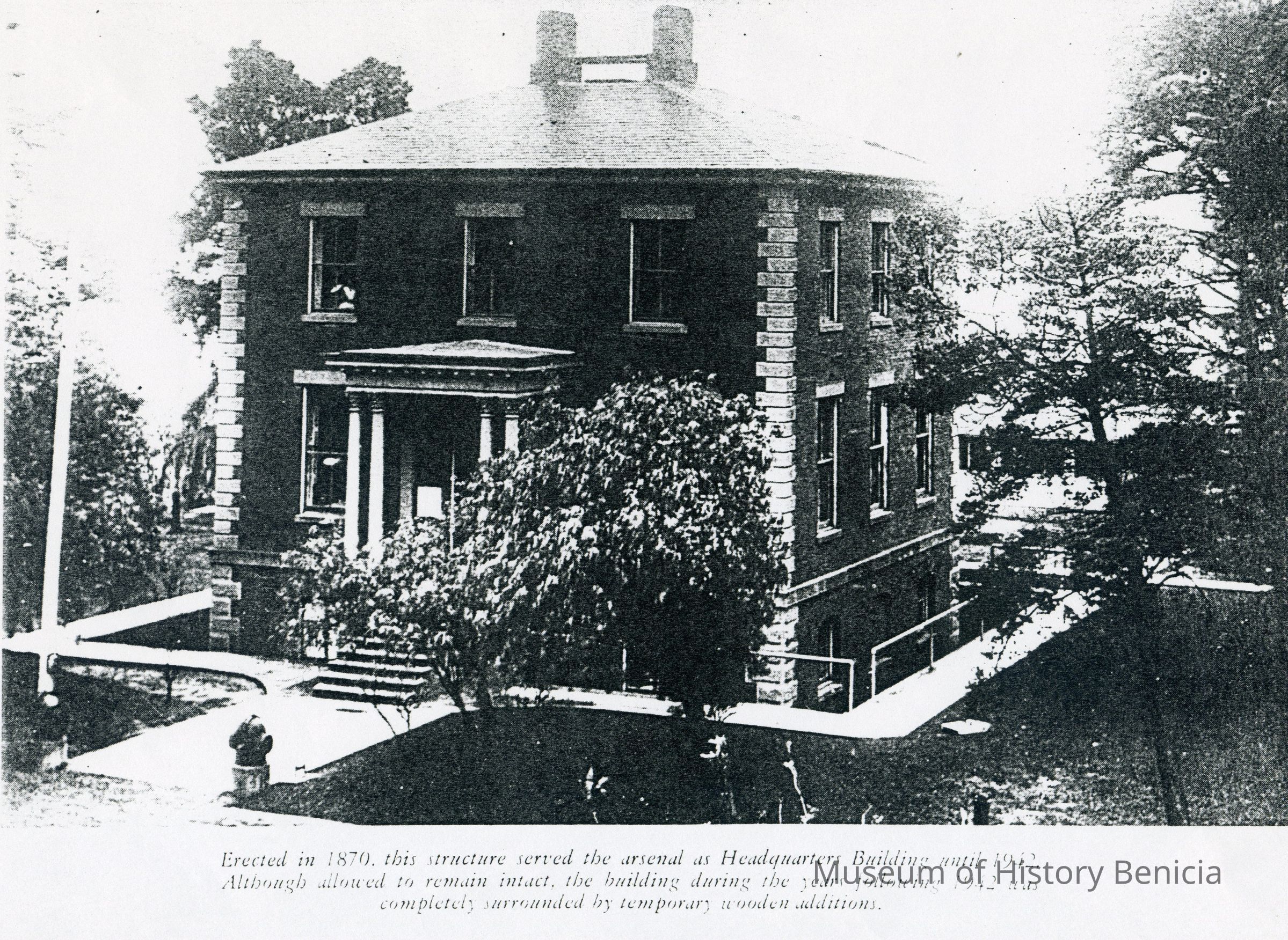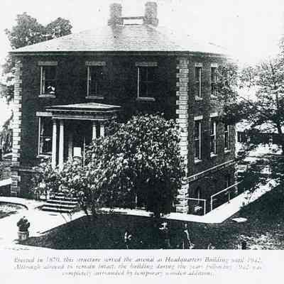 Black and white photocopy of an original photograph located at the Rock Island Arsenal: Arsenal Headquarters Building, built in 1872, which served as headquarters until 1942. Although intact, the building was eventually completely surrounded by temporary wooden additions.Collection
