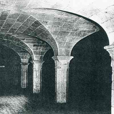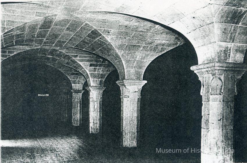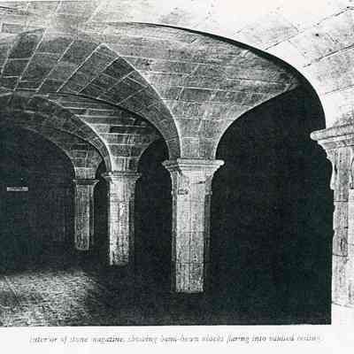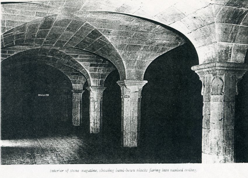 Black and white photocopy of an original photograph located at the Benicia Arsenal (Powder Magazine 10) "Interior of the powder magazine, showing the craftsmanship of the hand-hewn blocks, vaulted ceiling and decorative trim."Collection