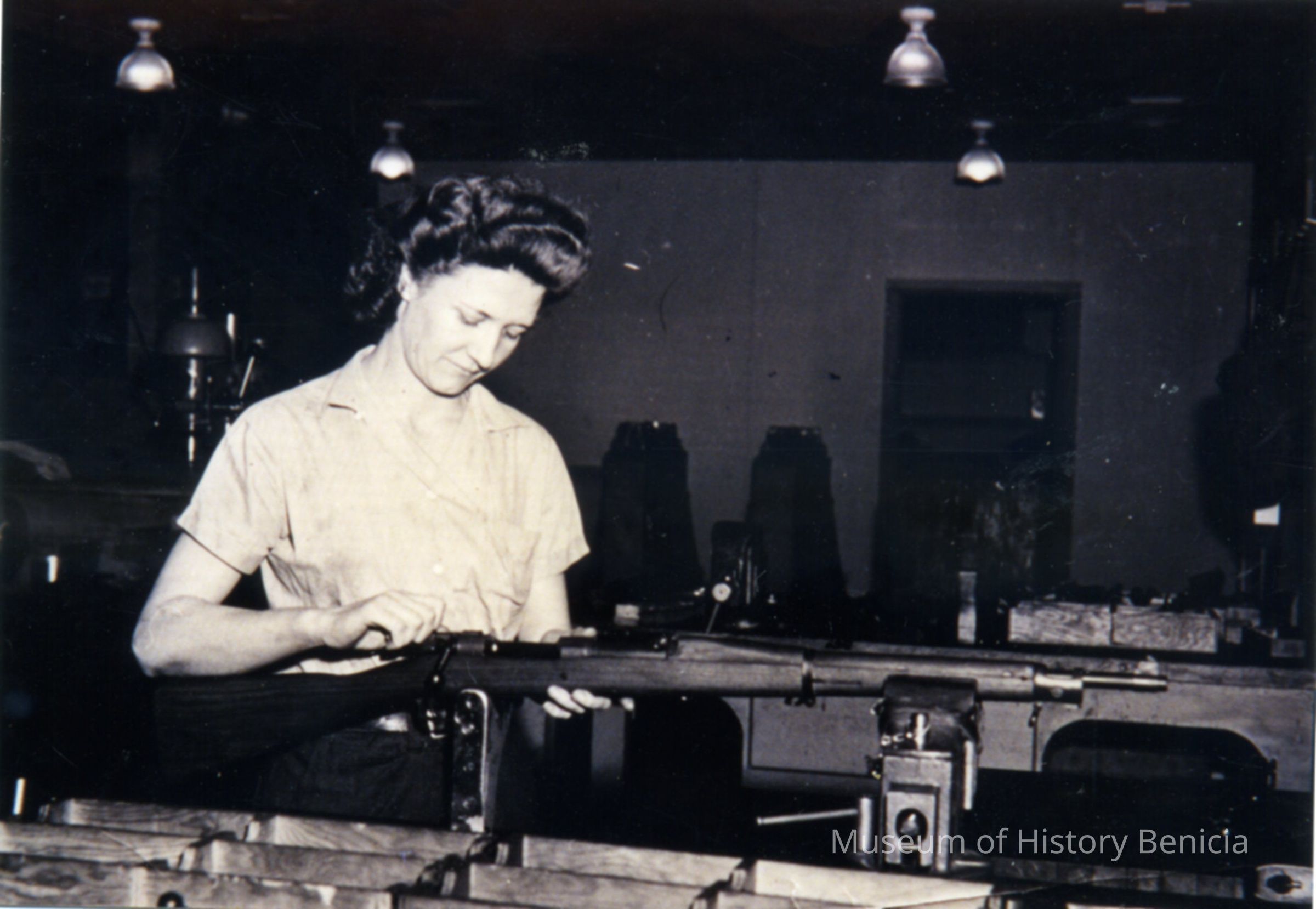 Bernice Chiotti inspects a rifle in the small arms shop at Benicia Arsenal. Rifles machine gums and other weapons were served - she worked there. 1943 B/W photo Duplicate 2 5" X 7Collection