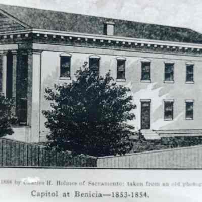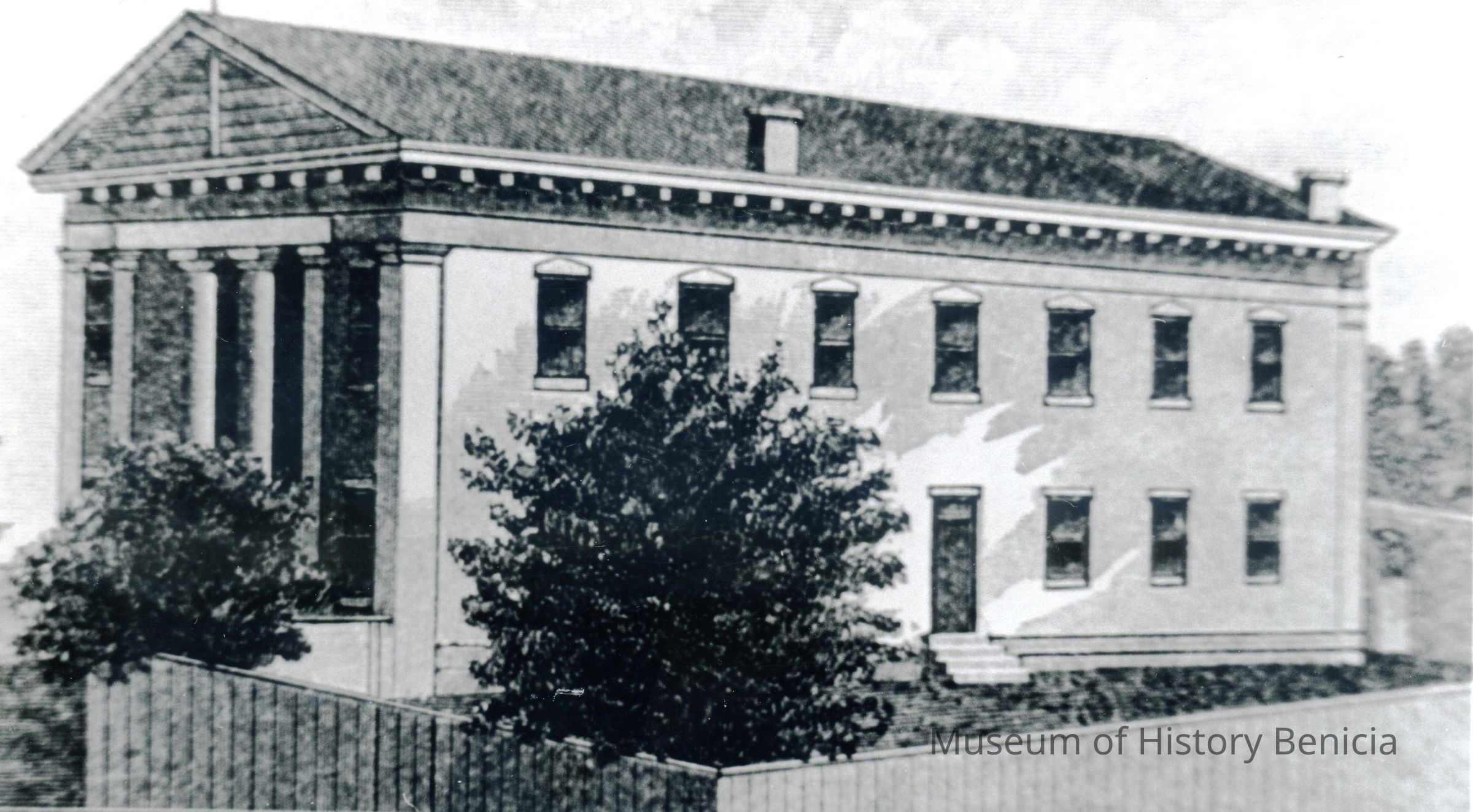 The caption reads: Engraved in 1888 by Charles H. Holmes of Sacramento: taken from an old photograph. Capitol at Benicia - 1853-1854.Collection