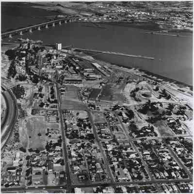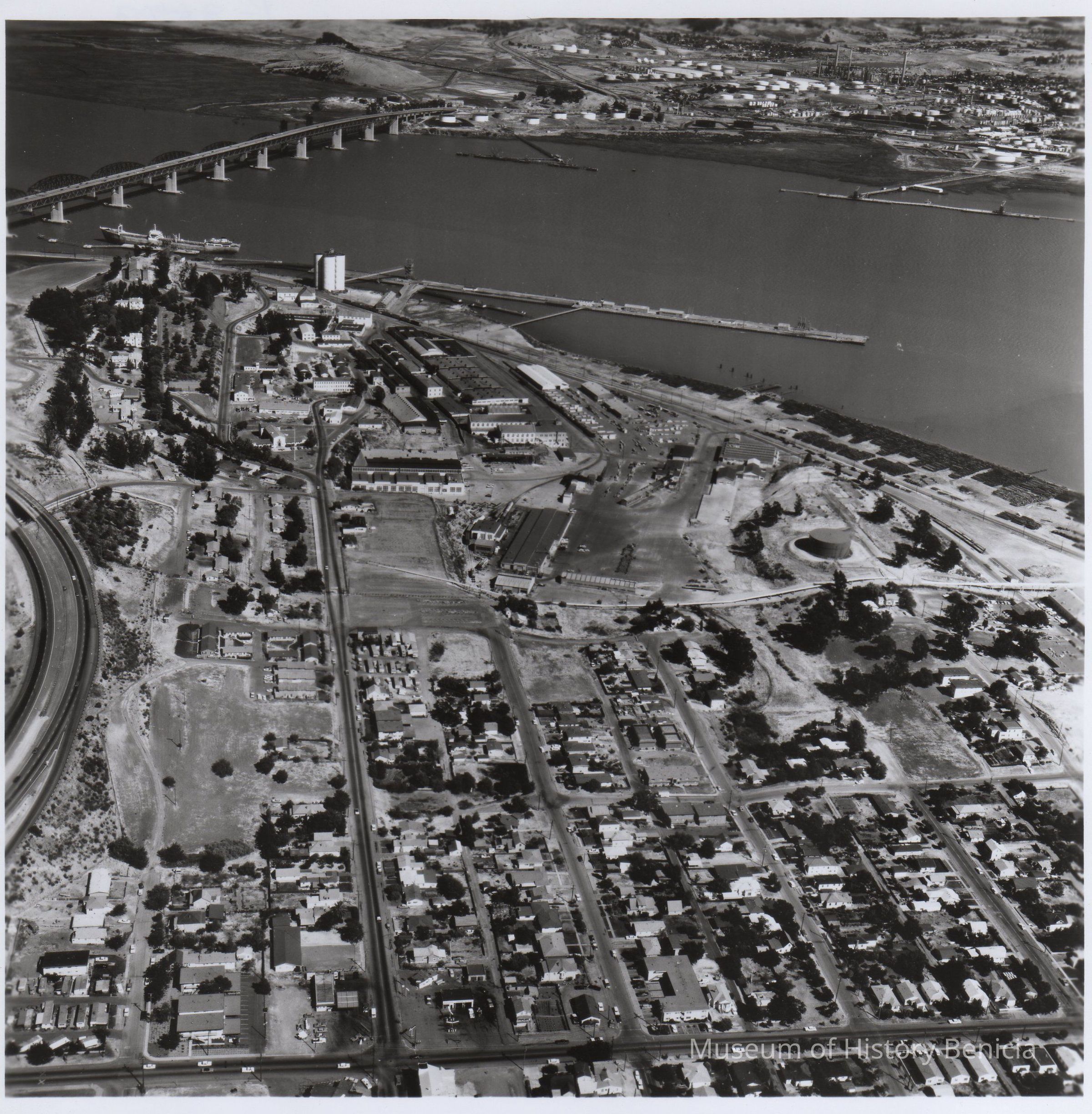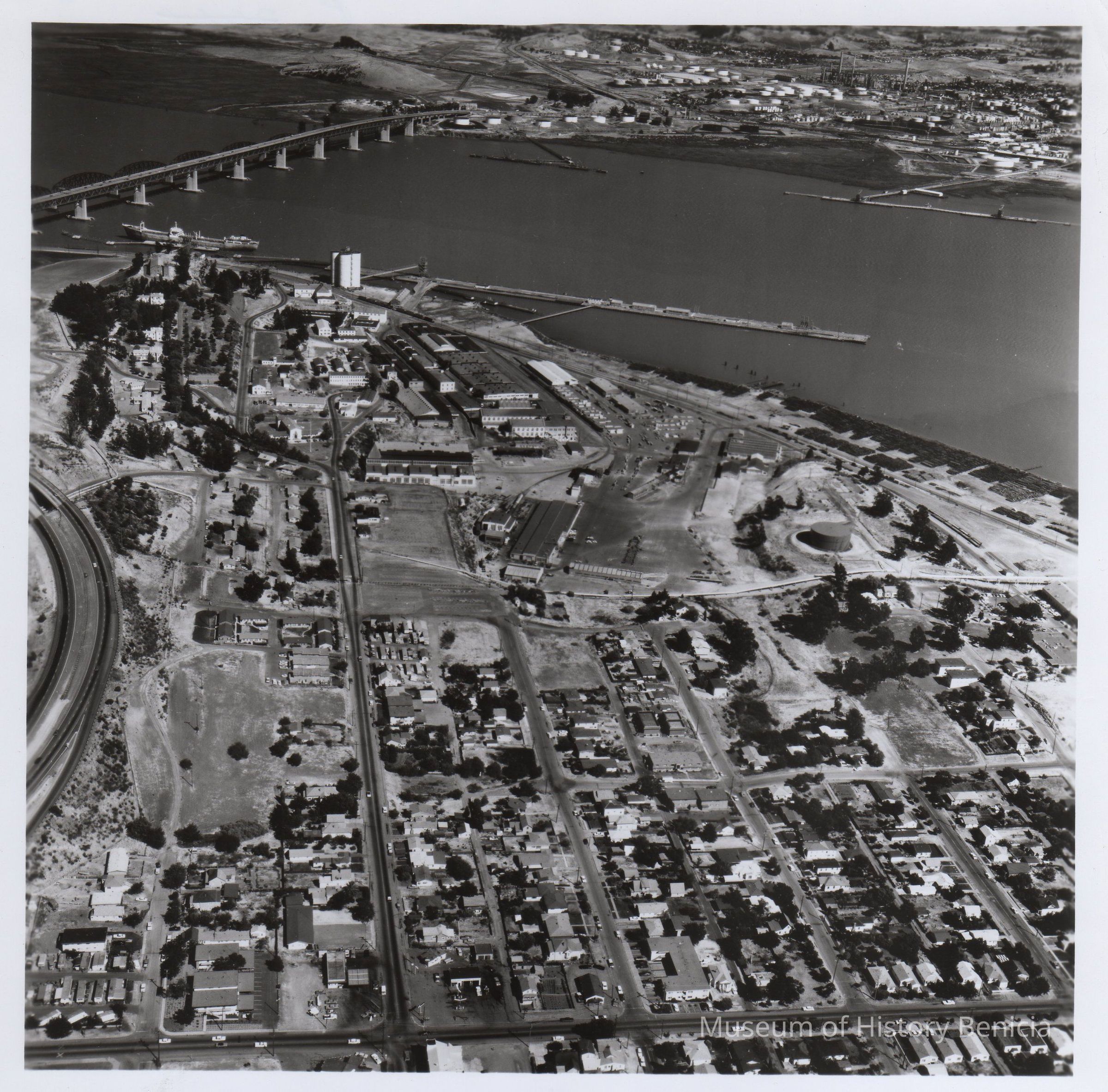 Black and white aerial view looking east showing a portion of Benicia, Benicia Industries, dock area, and bridge.