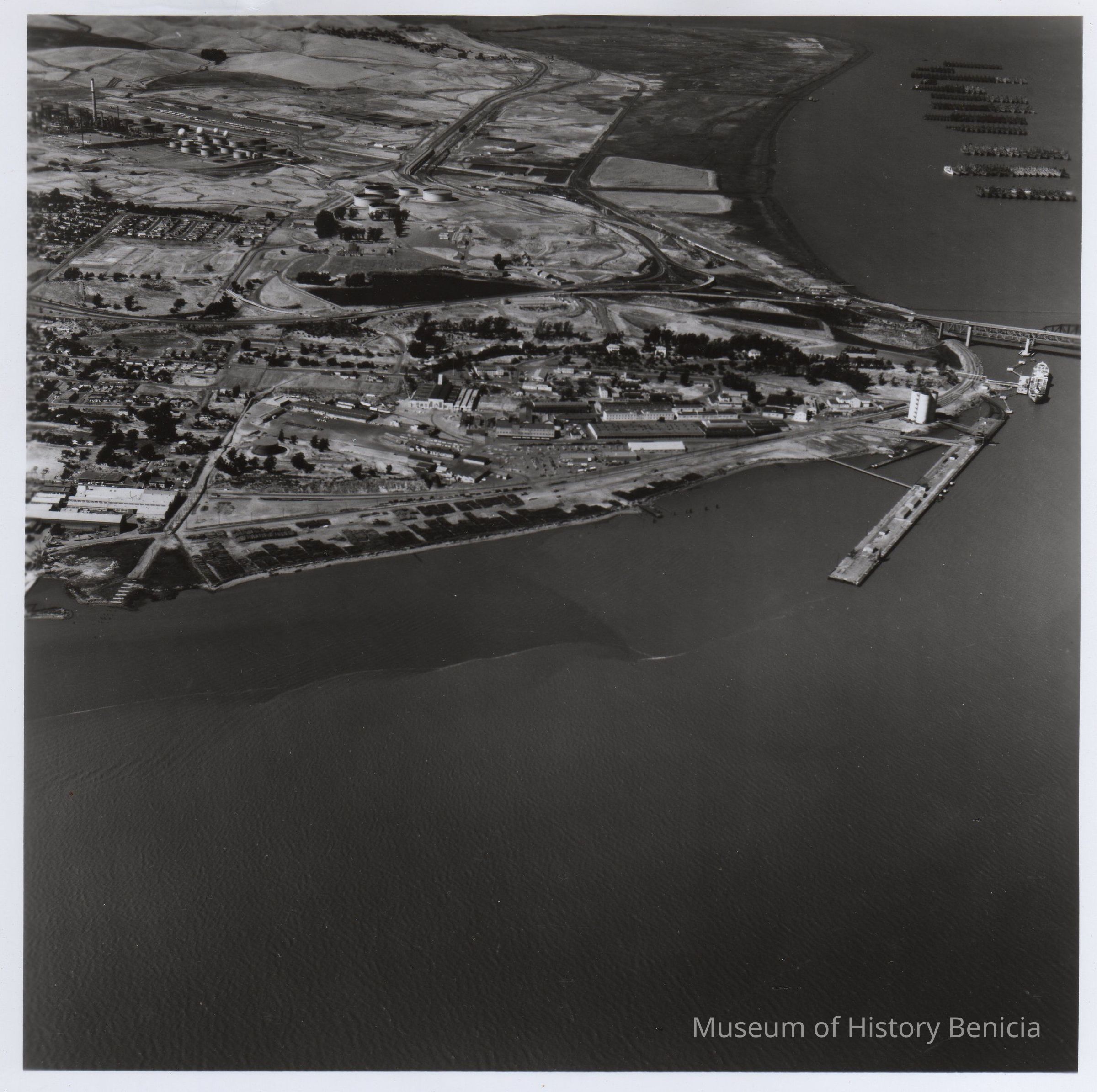 B/W aerial view looking east across docks, Industrial Park, a part of Benicia, Mothball Fleet (top right).