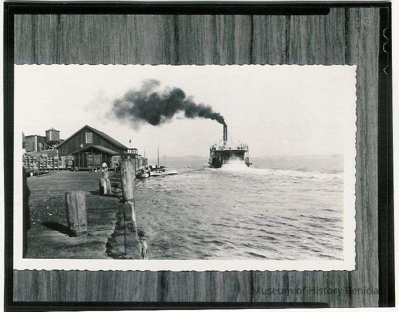 Copy of an orignial B/W photograph showing a ferry in proximity to the Benicia Wharf