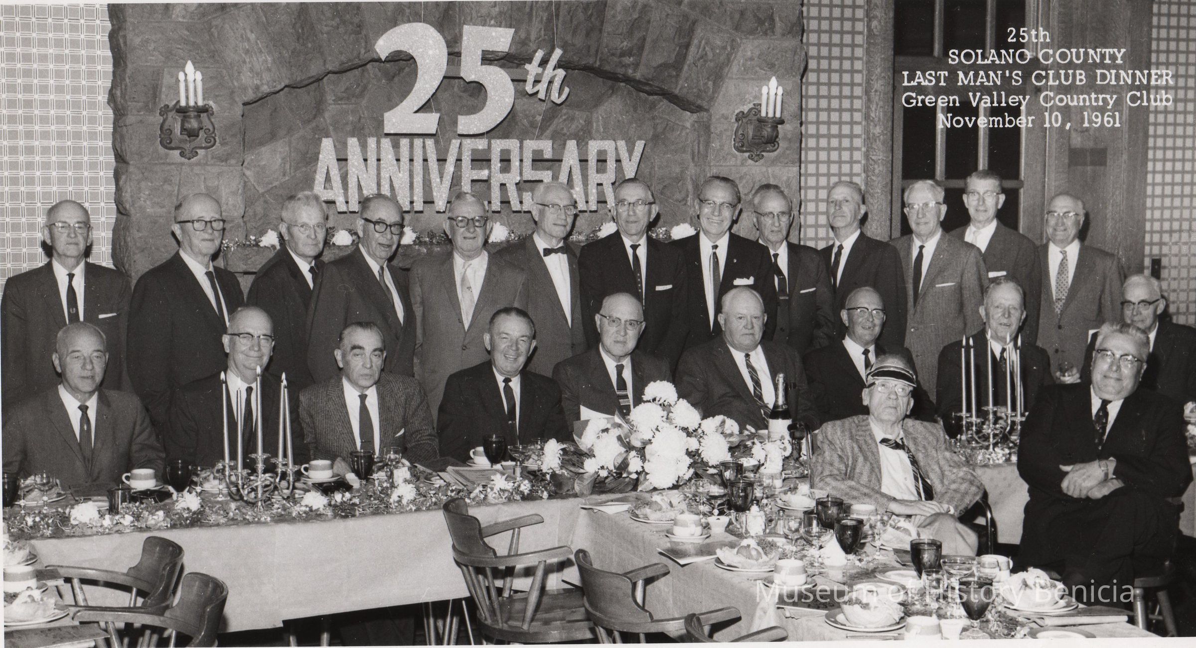 2 rows of men at banquet table. "25th/Solano County/Last Man's Club Dinner/ Green Valley Country club/November 10, 1961" upper right "Nov. 10, 1962" on back in ink B/W photoCollection