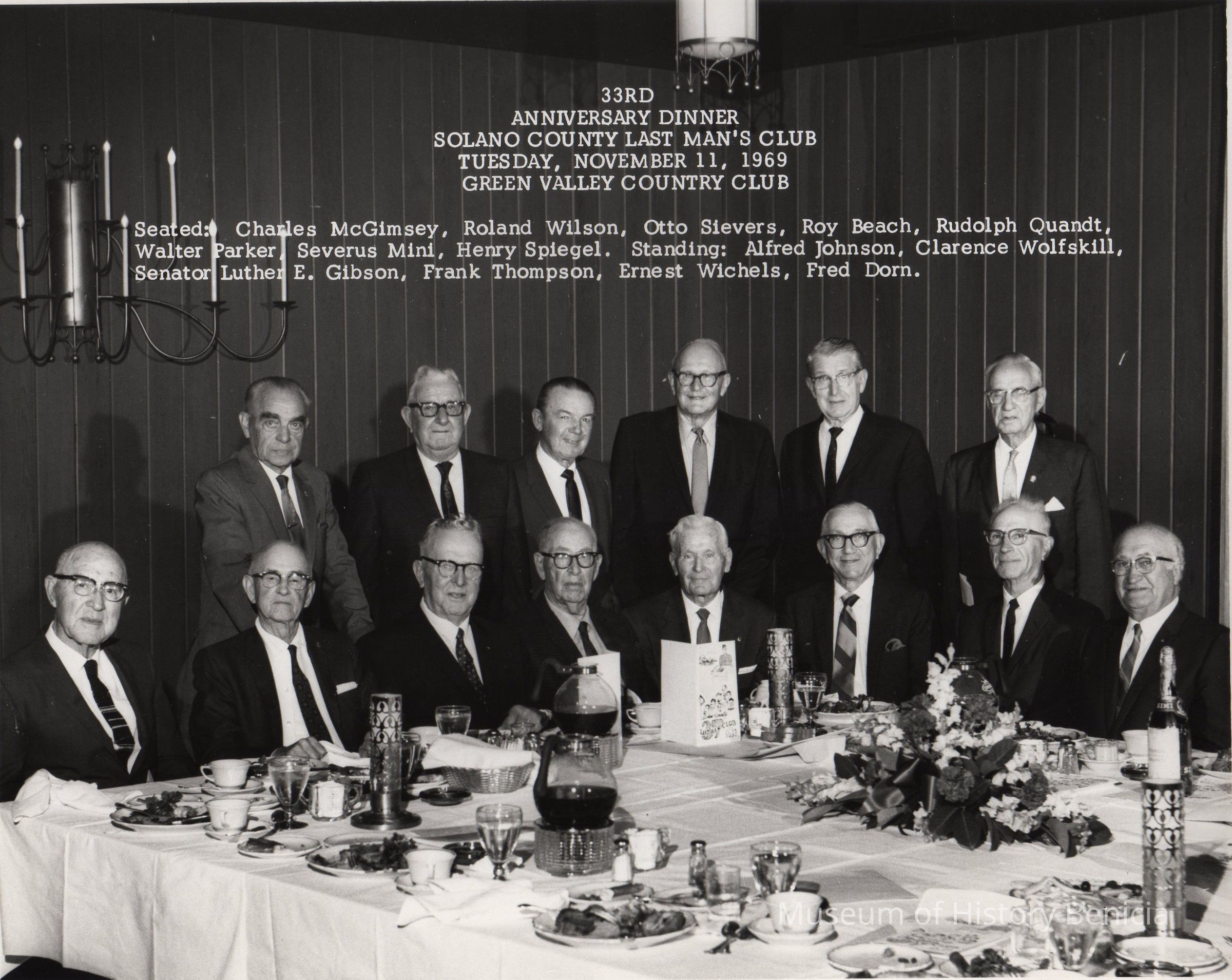 2 rows of men at banquet table. "33rd Anniversary Dinner/Solano County Last Man's Club/ Tuesday, November 11, 1969/Green Valley Country Club" and indentifications top center 1969 B/W photoCollection