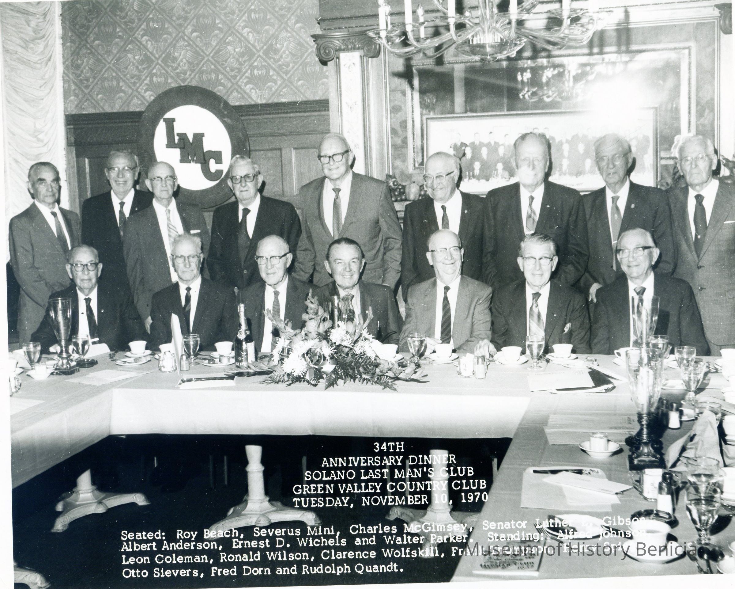 2 rows of men at banquet table "34th/Anniversary Dinner/Solano County Last Man's Club/Green Valley County Club/Tuesday, November 10, 1970" and indentifications bottom center 1970 B/W photoCollection