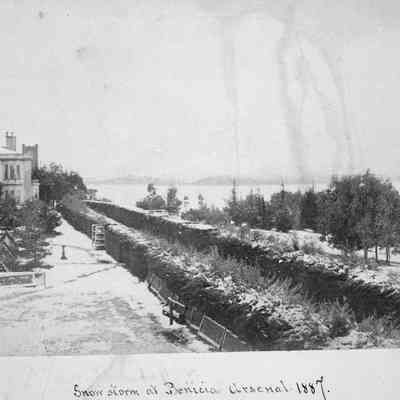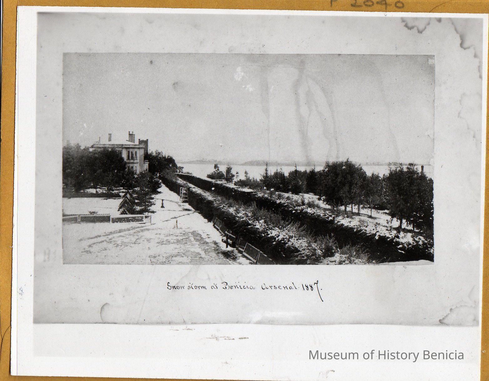 Snow Storm at Benicia Arsenal - Commanding Officer's Headquarters at left with Clock Tower in background 1887 B/W photo. (Negative is in 5/F7/2.2)Collection