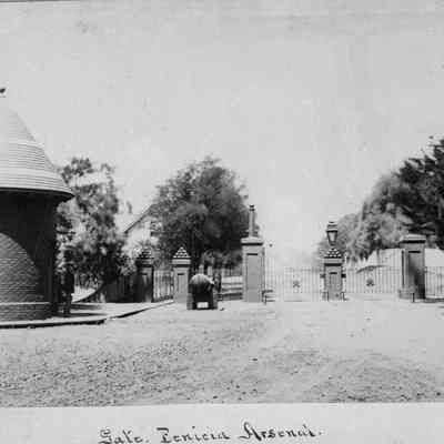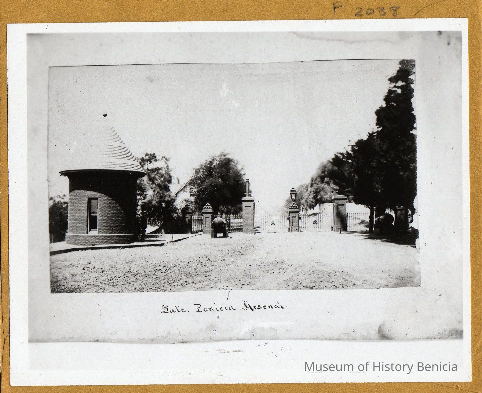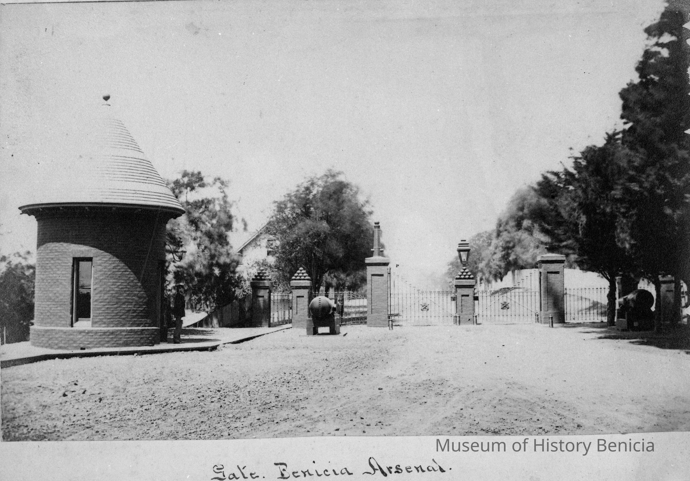 Gate and entrance to Benicia Arsenal. Stone guard house to the left. Two cannons on side of the double gate. 1886 B/W photo and negative. (Negative is in 5/F7/2.2)Collection