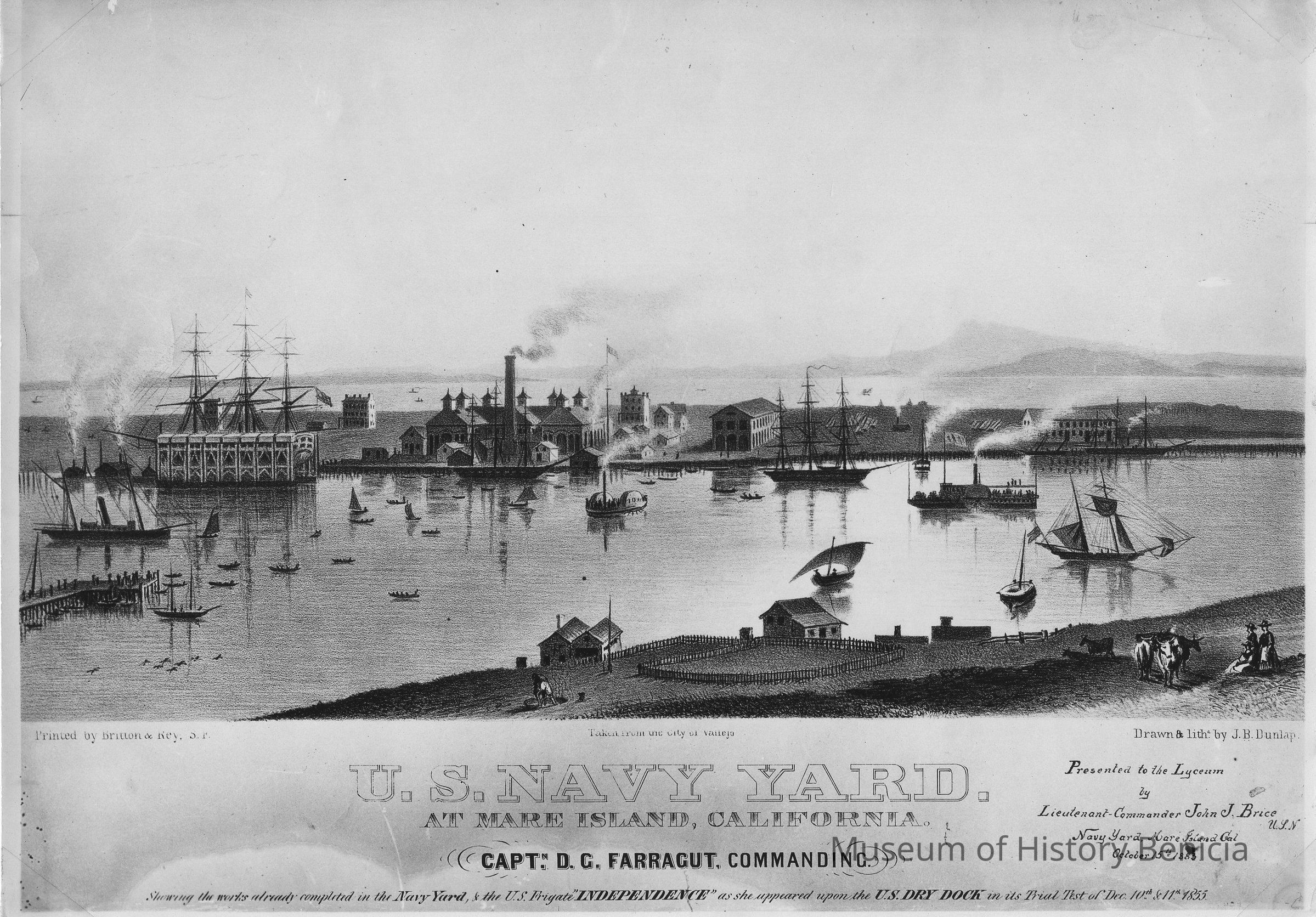 B/W photograph of print "US Navy Yard at Mare Island, California...showing...US Frigate Independence...1855...+written in ink on original print "presented to the Lyceum by Lt-Com John J Brice USN... Oct 15, 1833." Stamped on back: Released Official Navy Photograph, If published, credit line must read: "Official U.S. Navy Photograph", released by Mare Island Navy Yard.Collection