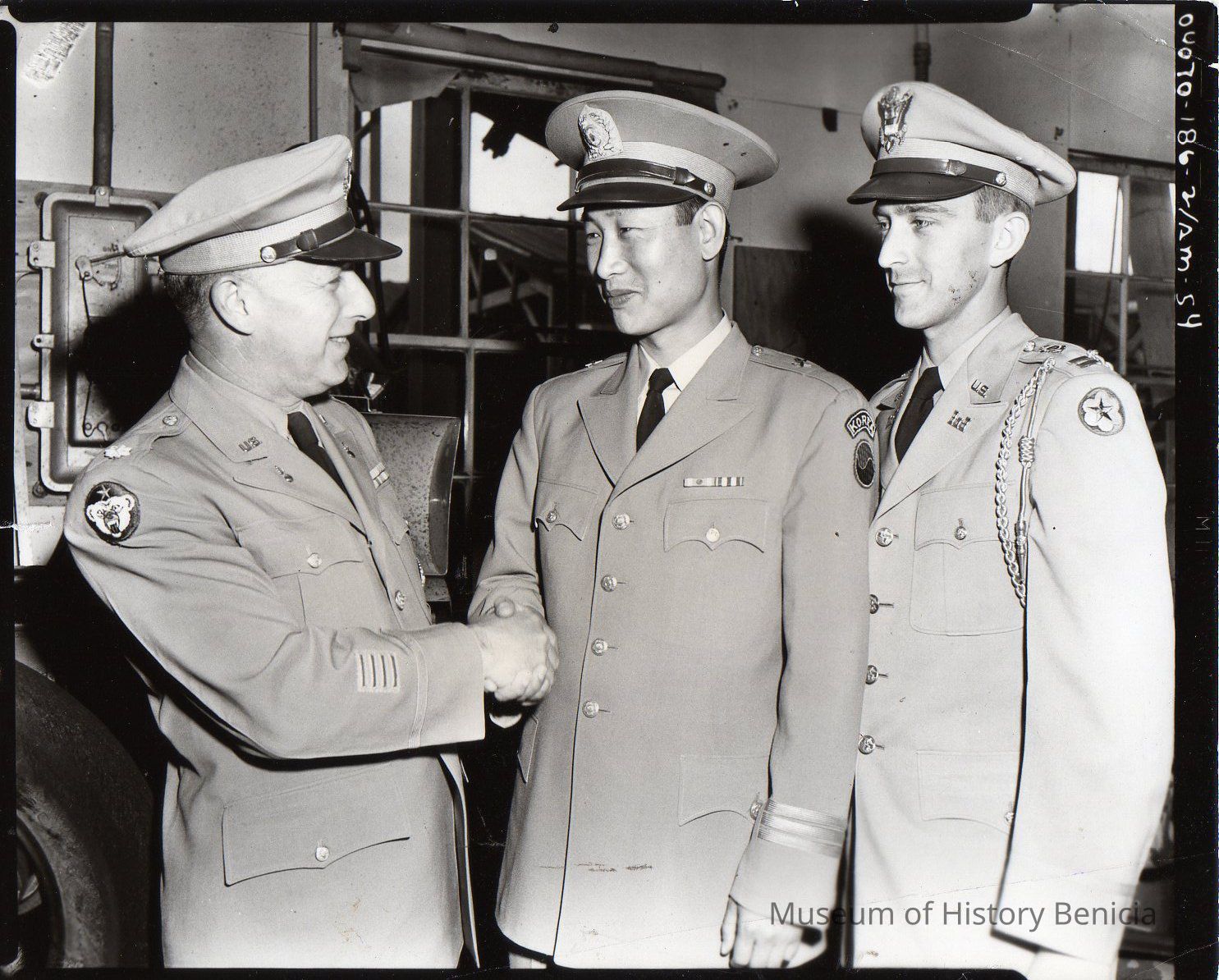 General Hwang Yup, Republic of Korea visiting Benicia, 6-8-54. Left Lt.Cd Daniel Allison, Commanding Officer, General Yup and Capt. Easton Zahlackas, interpreter. 1954 B/W photo