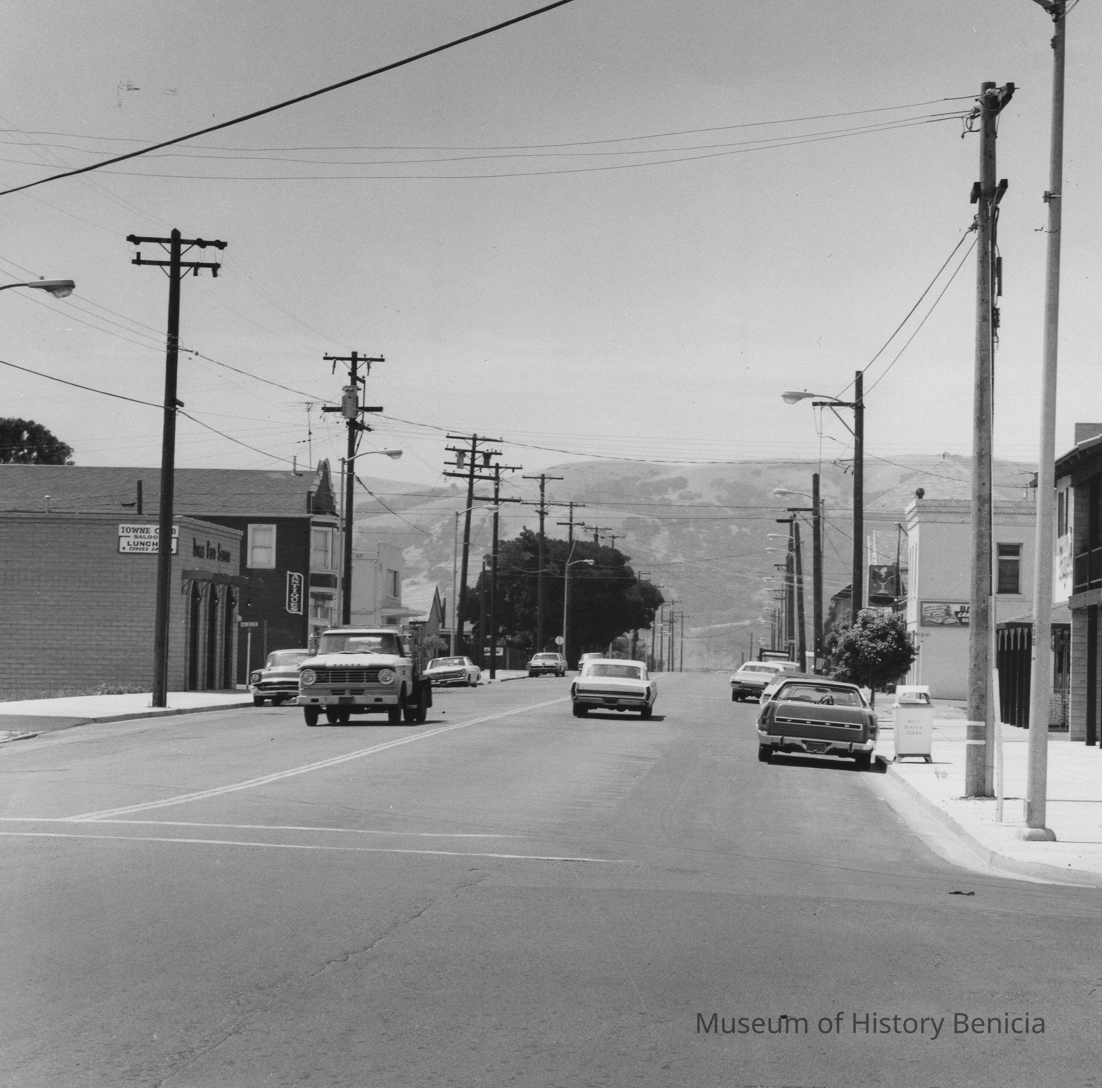 the photograph was taken from the intersection of First Street and F Street looking south towards the Carquinez Strait