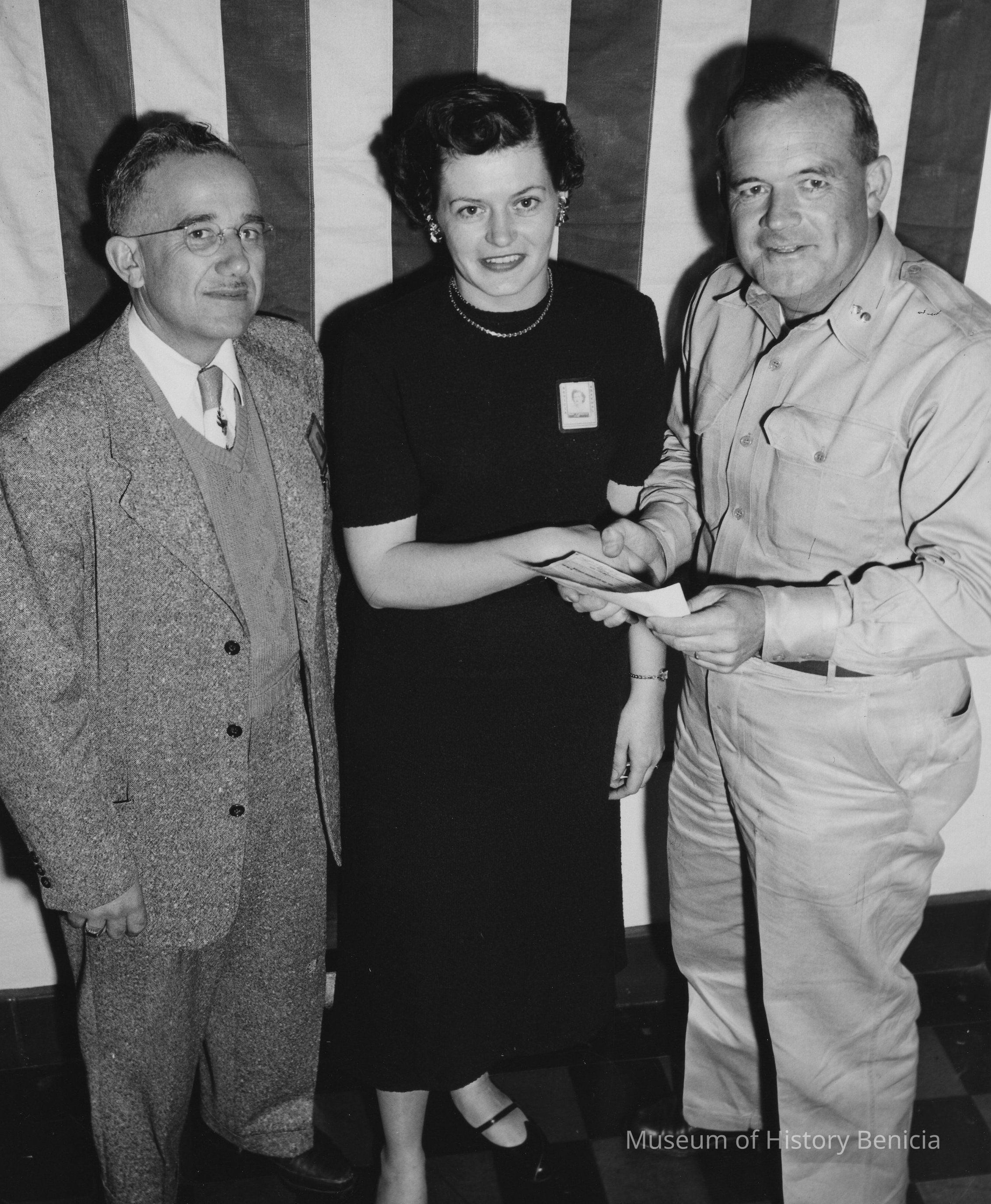 B/W photograph: On the right is Captain Harold Alvin Miller (in Benicia 06/1952-06/1955) giving a woman which looks like an award. (perhaps taken at an award presentation ceremony)Collection