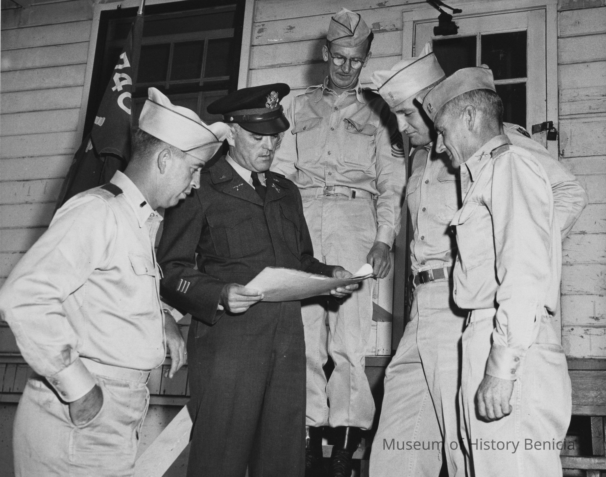 B/W photograph: Five men in uniform ( four in light kakhi) on building steps looking at papers in hand of man in dark uniform.Collection