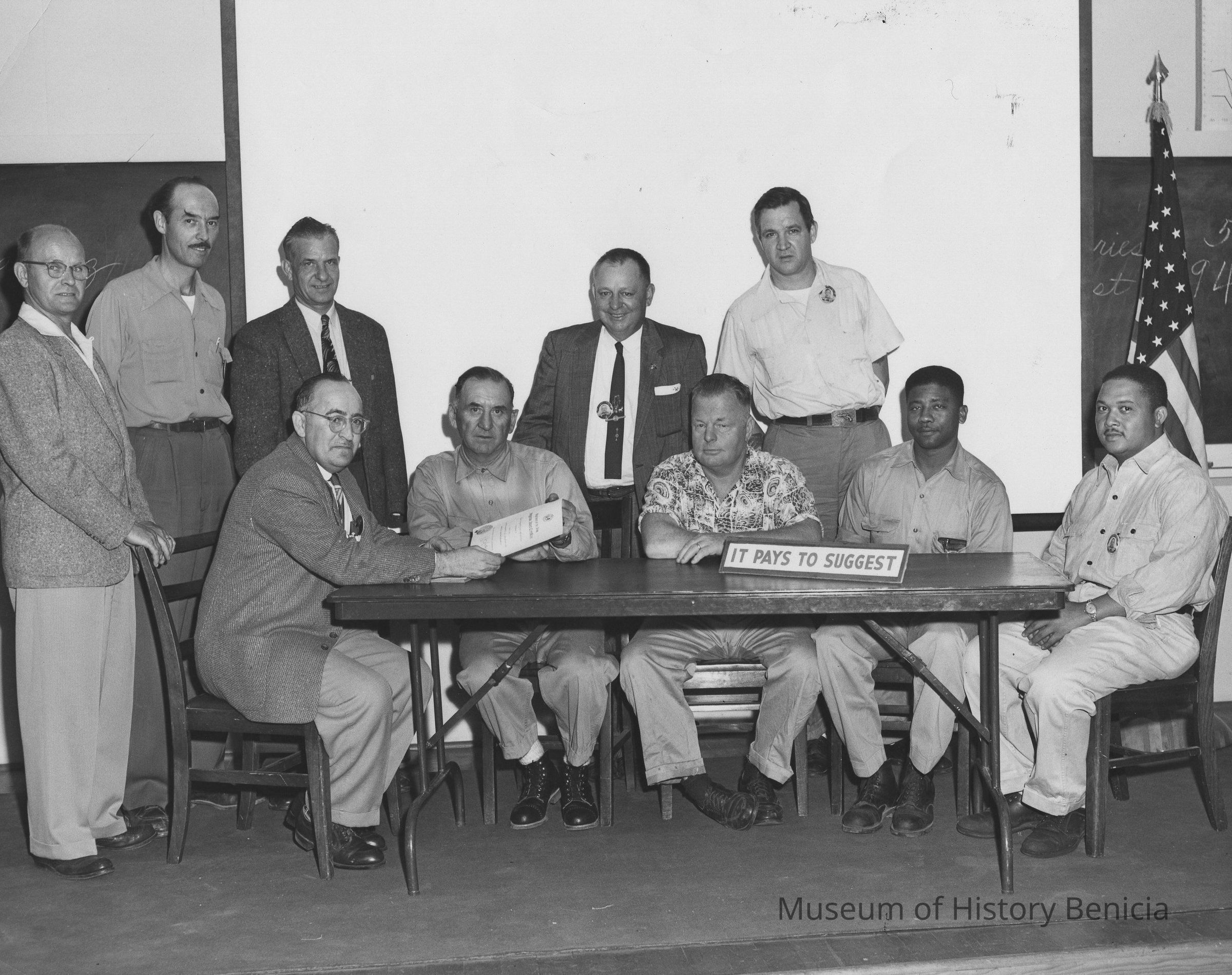 B/W Photograph: ten men grouped around a table. On table: sign: "IT PAYS TO SUGGEST." On back: "04071-610-YORD-56" in pencil, "Benicia Arsenal, Sept. 19, 1956" in ink, identification of men in ink" left to right: Thomas Wann, Norbert Lannon, Clyde Forrester, Hugh McDermott, Villans Auten, Fred Wesley, John Schnoor, Clarance Wingert, Earnest Madden Jr. Clarence Poche.Collection