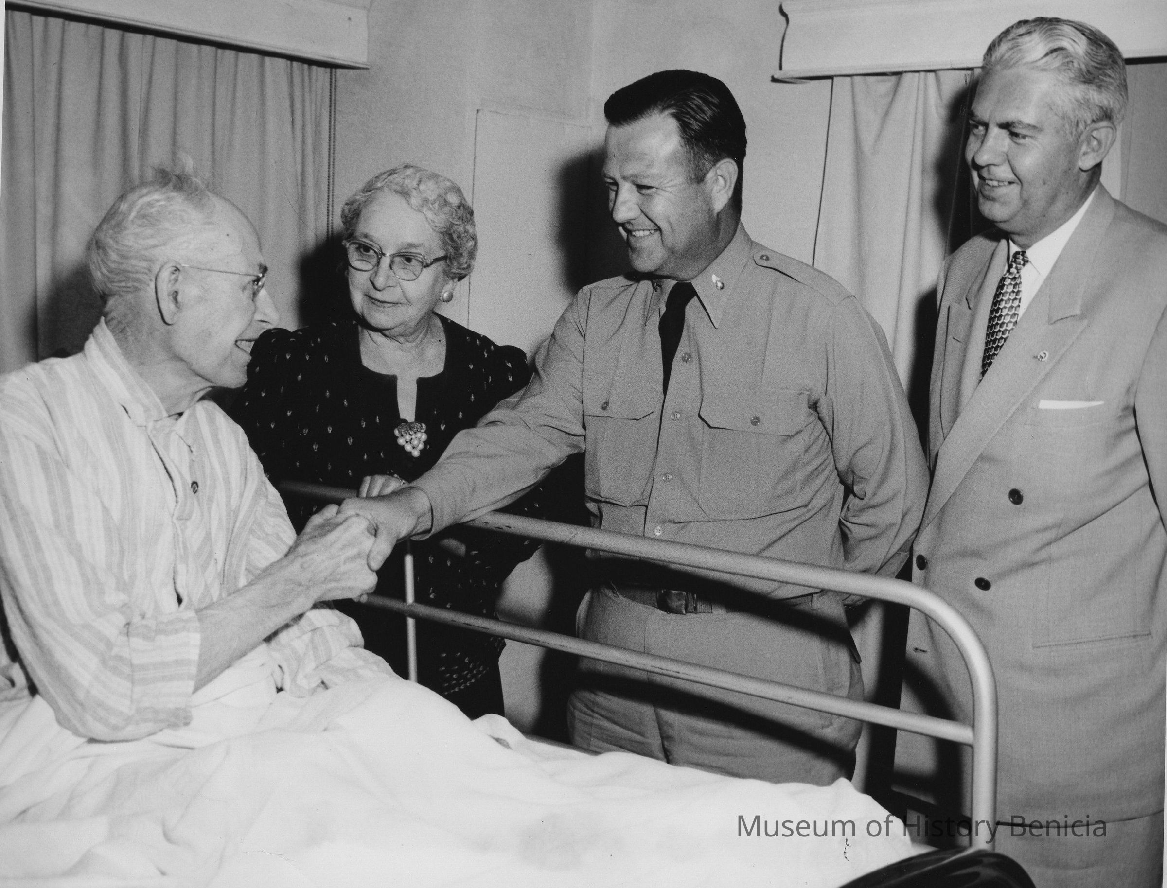 B/W Photograph: Col. Francis Hall commanding officer of Benicia Arsenal, expresses appreciation to Oscar H. Olsen of the latters long service as blacksmith at Benicia Arsenal after presenting him with a 20 year pin, first service pin to be awarded by the installation.Presentation was in a Benicia hospita where Olsen is confined. At the bedside are also Mrs. Olsen and John W. Kamb, civilian executive of the arsenal. On back: typewritten, glued-on description and IDs.Collection