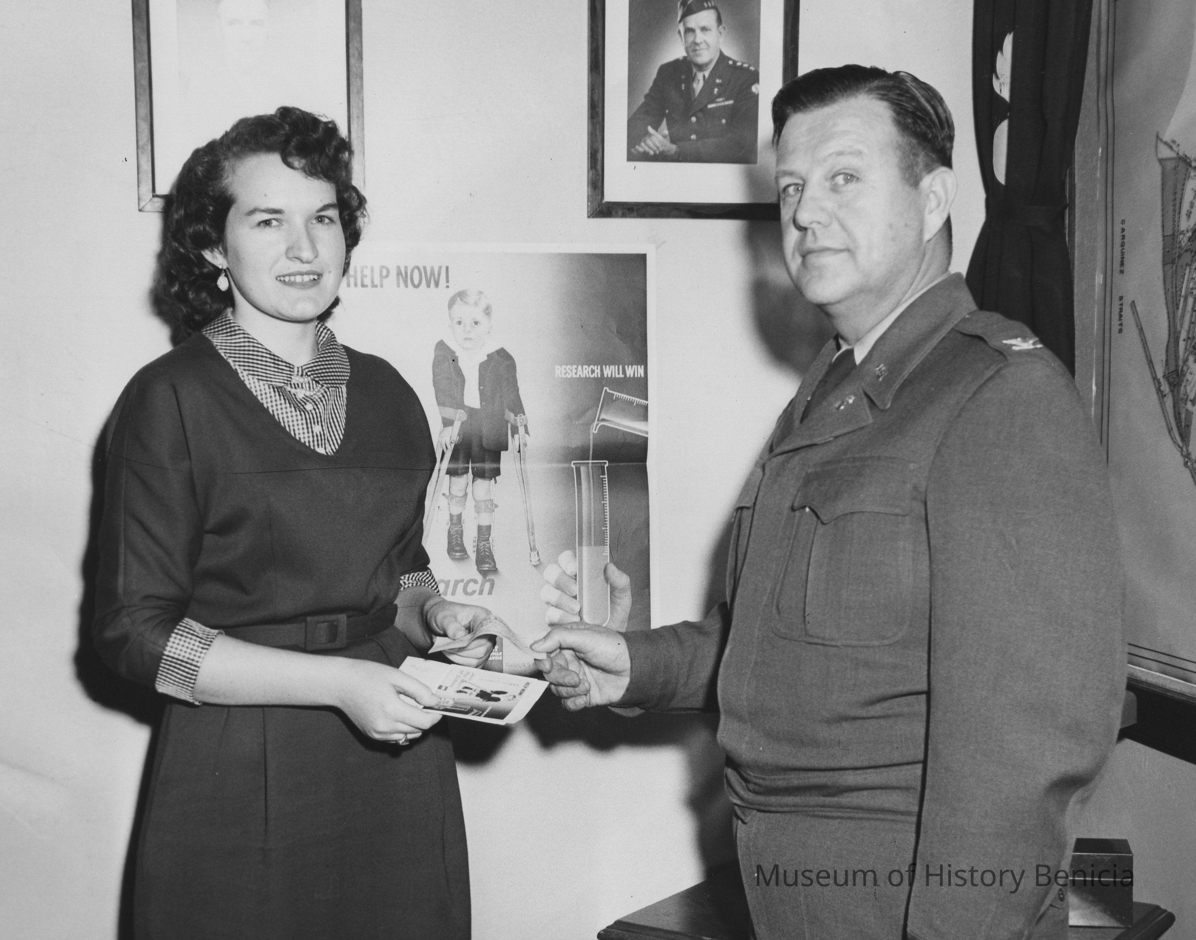 B/W Photograph: Col. Francis Hall gives his March of Dimes contribution to Miss Lettie Horn, an arsenal campaign chairman. The goal has been set at a contribution of $2 per person.