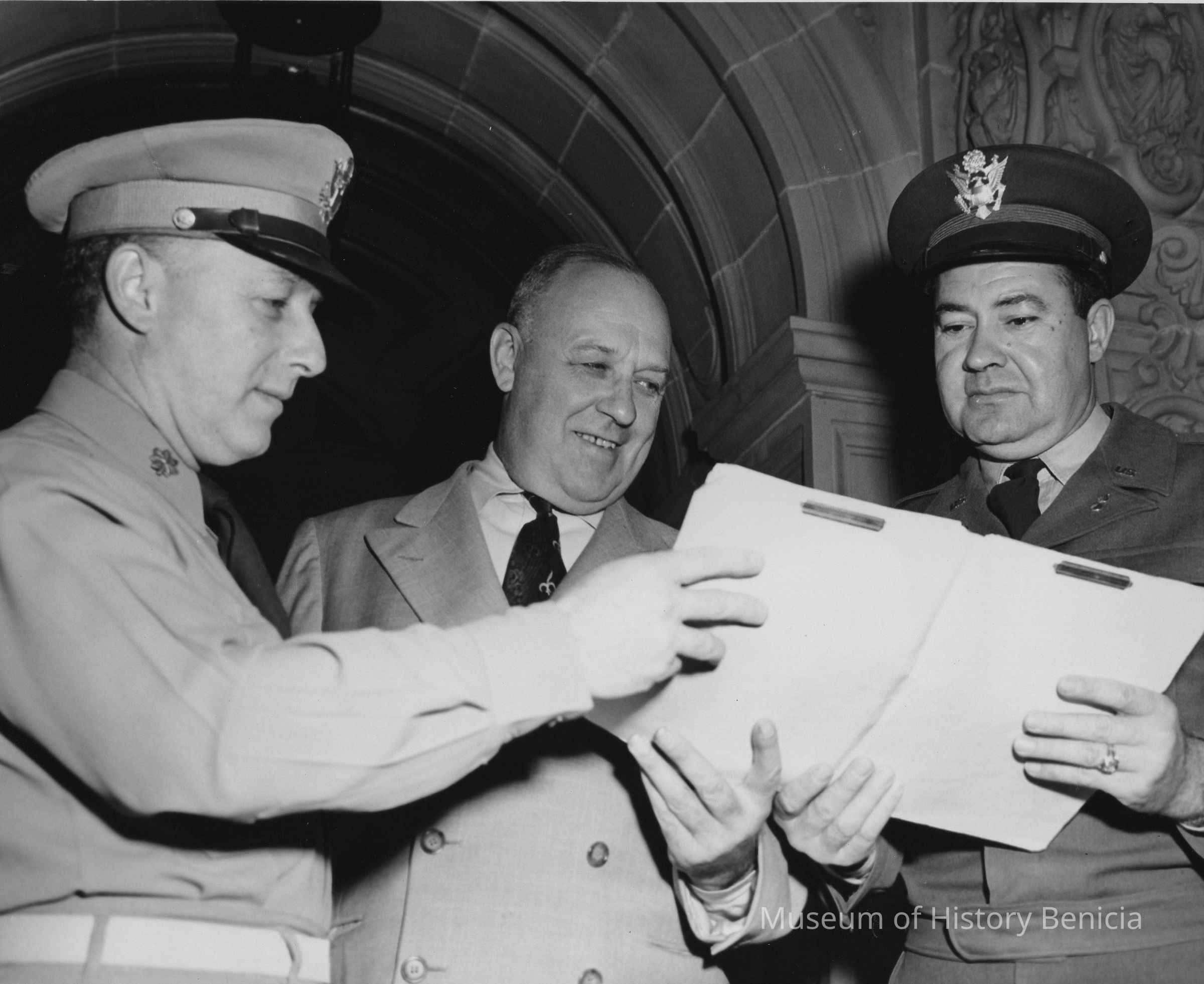 B/W Photograph: Lt. Col. Daniel Allison, John E. Berry, and Capt. George T. Dyson look at their inspection tour schedule.