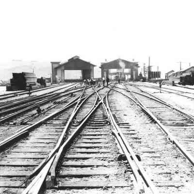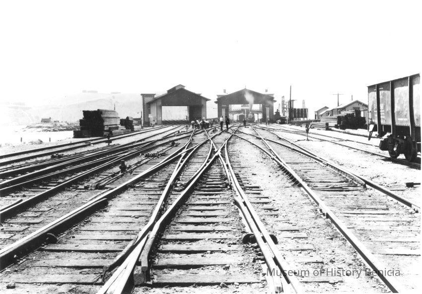 B&W photo of Benicia rail yards going to the ferry docks. On the back it says "SP X2577 View of Benicia railroad yard looking east about 1923".Collection