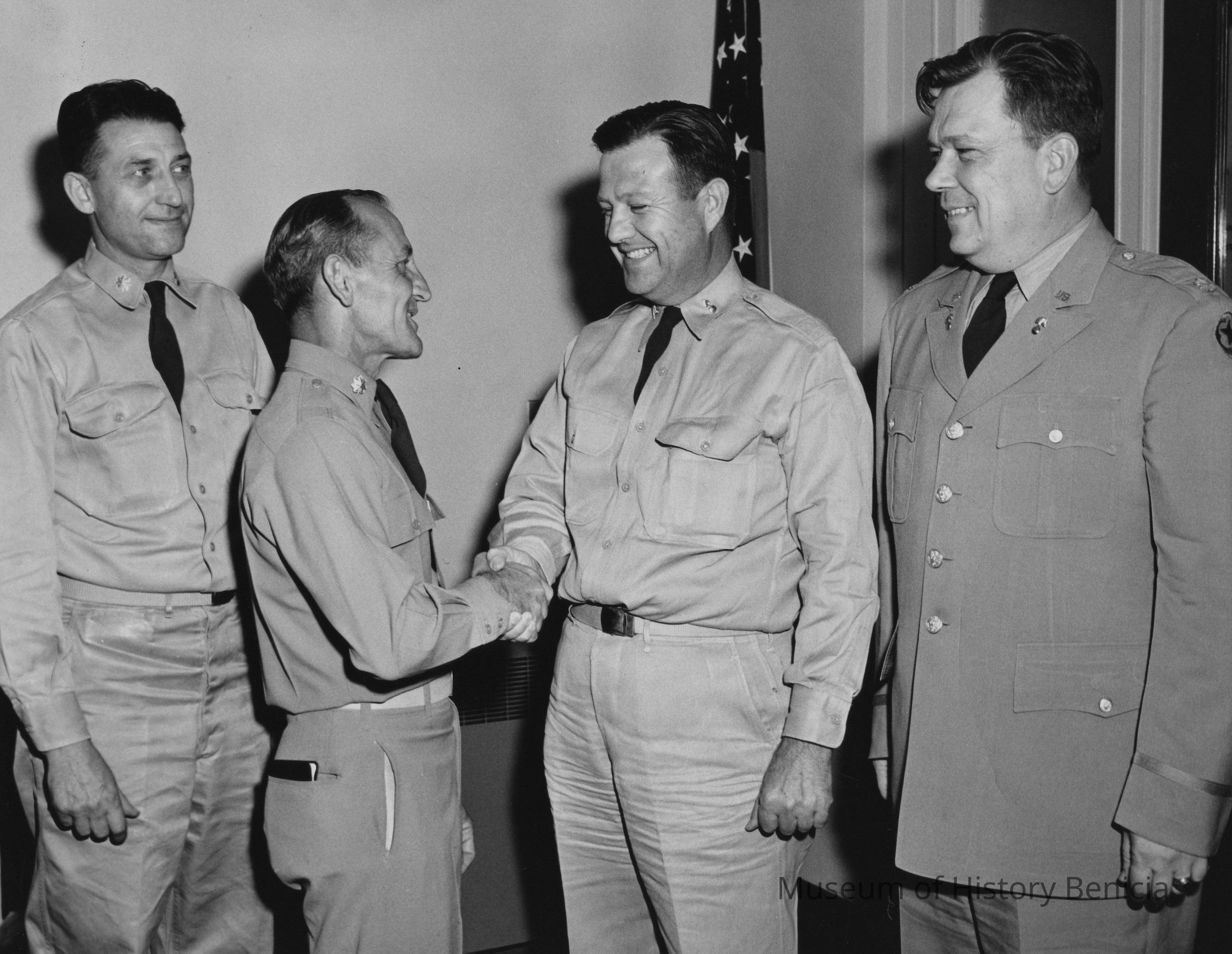 B/W Photograph: Major George W. Keller, second from left receives congratulations from Colonel Francis G. Hall, Benicia Arsenal commanding officer, upon his promotion from captain. Also congratulating the new major are Lt. Col. Charles E. Rust, Right and Maj. D.E. Livenspargar. On back typed, glued-on description w/IDs, "Keller Promotion" in red pencil.Collection