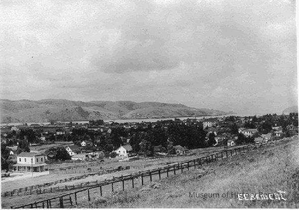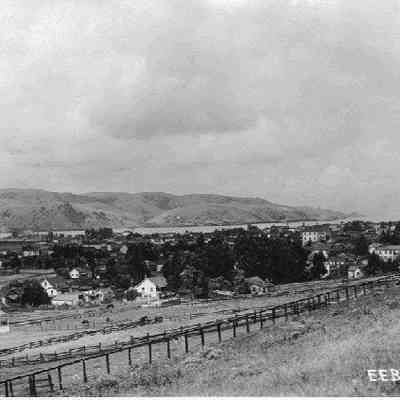View from northeast over Benicia. "E.E. Bement" in lower right corner. Fields in foreground. B/W photo.