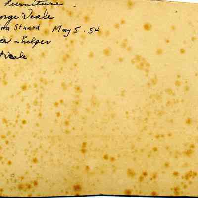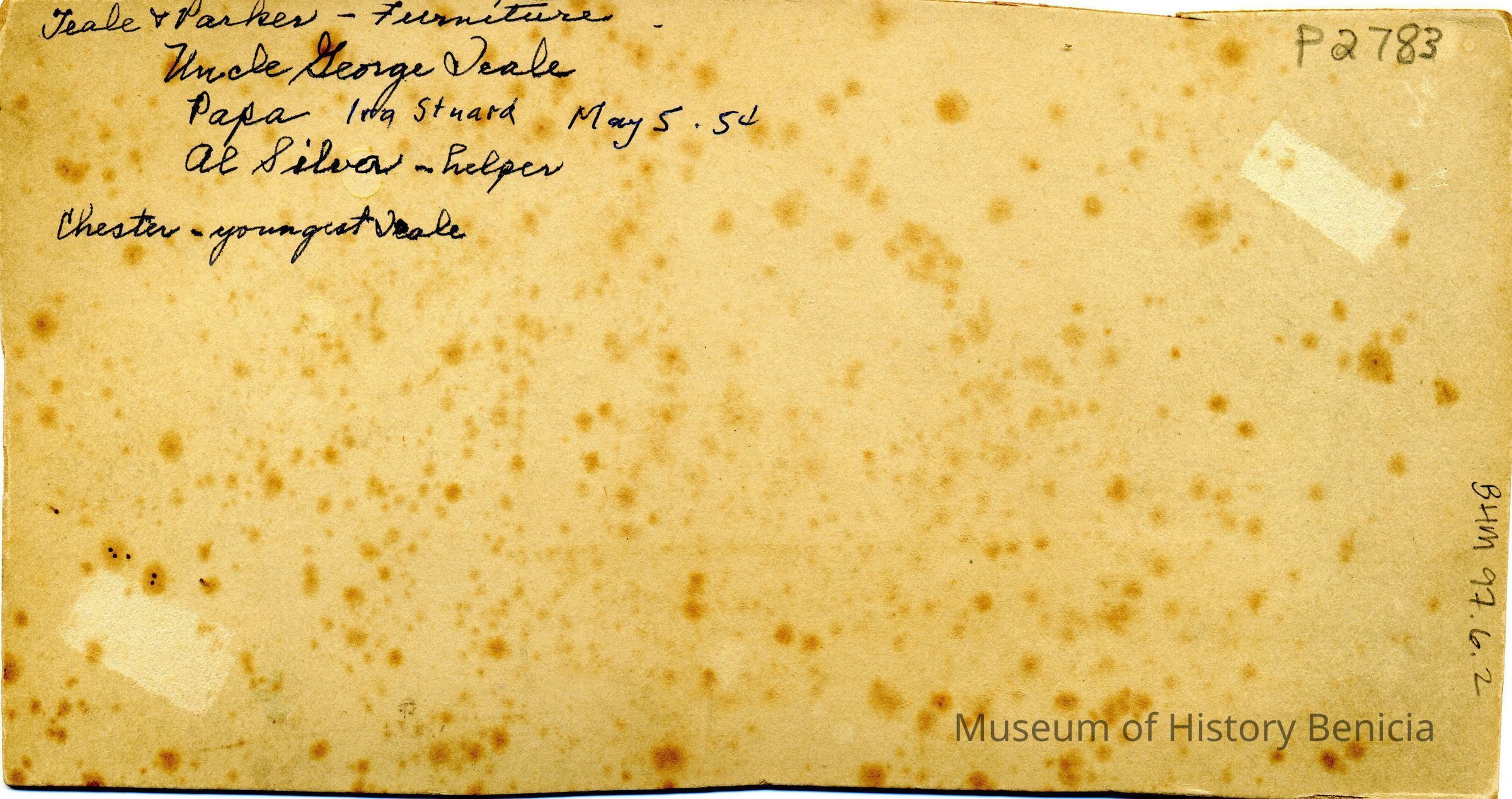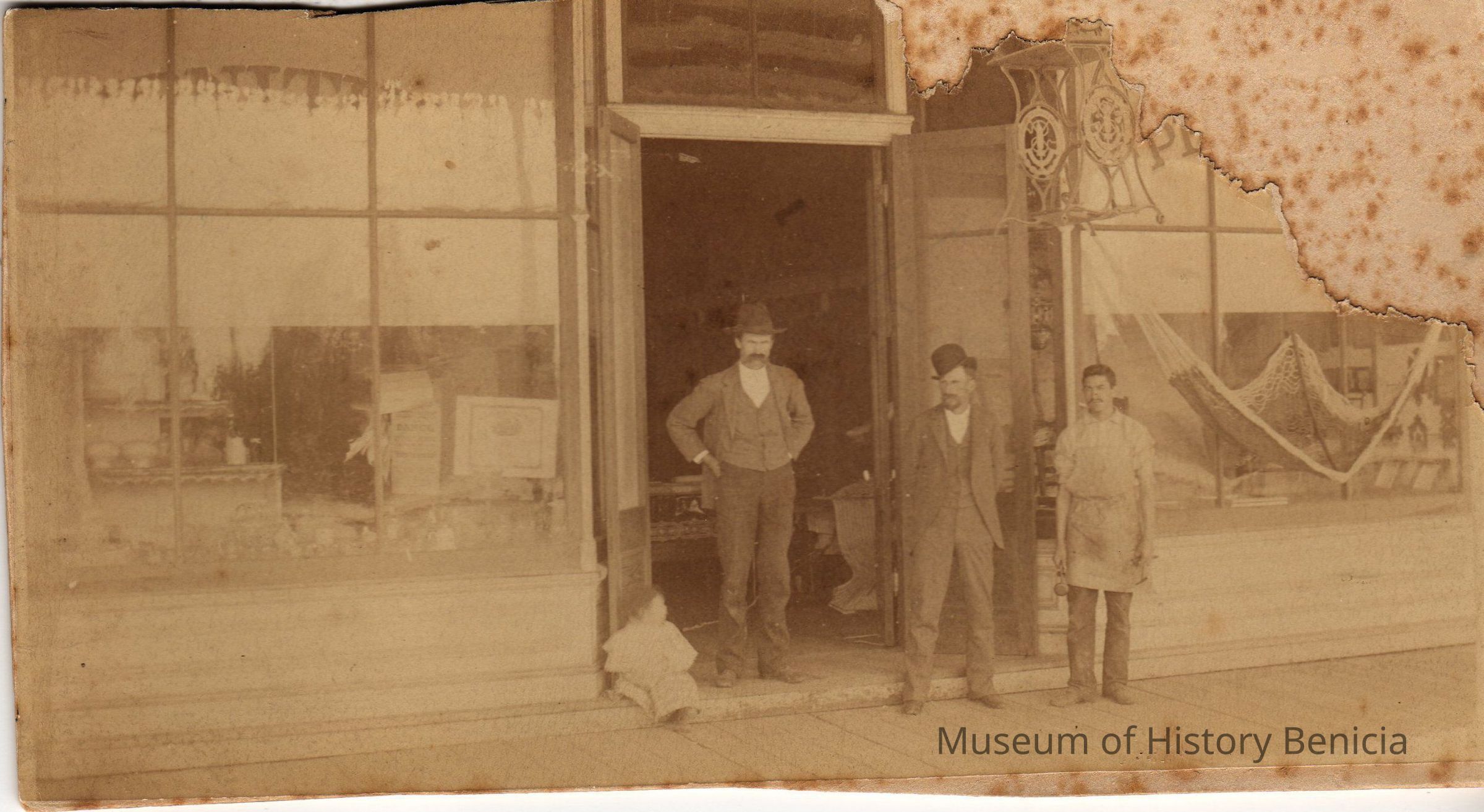 Albumen print of 3 men and toddler in front of store with sewing machine suspended over door. "Teale & Parker-- Furniture, Uncle George Teale, Papa Ira Stuard May 5 54, Al Silva--helper, Chester--youngest Teale" in ink on back.Collection