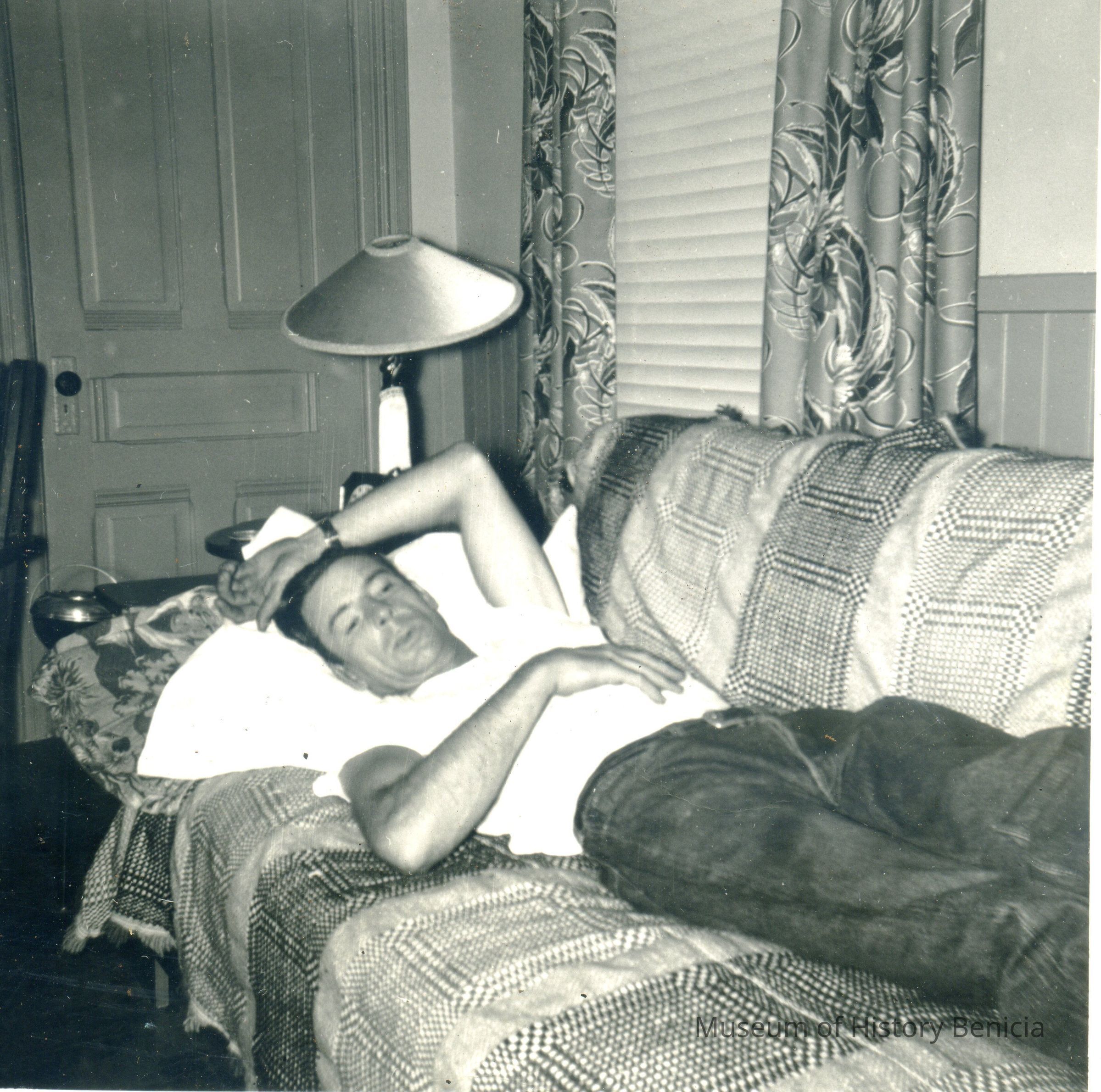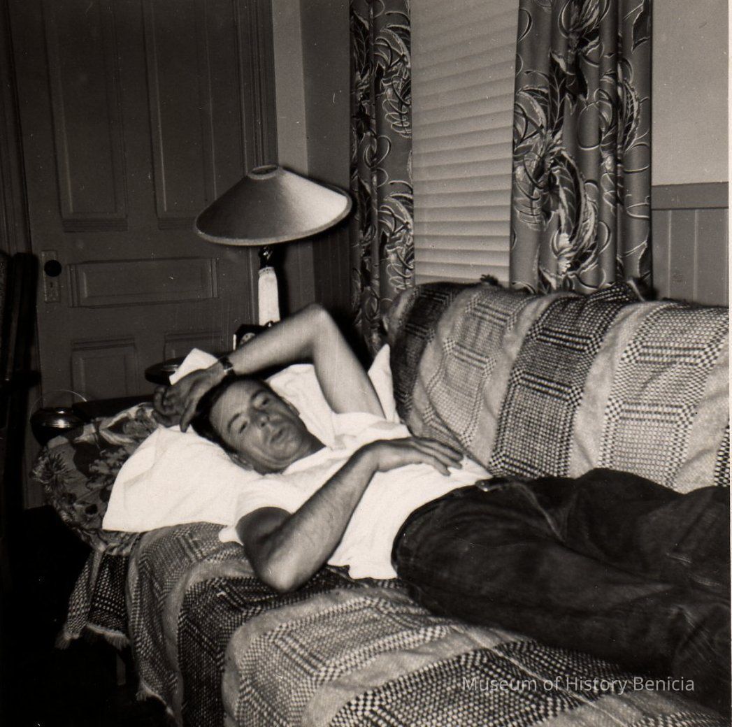 Black and white photo of man (Urban Braito) in jeans stretched out on sofa in a house.