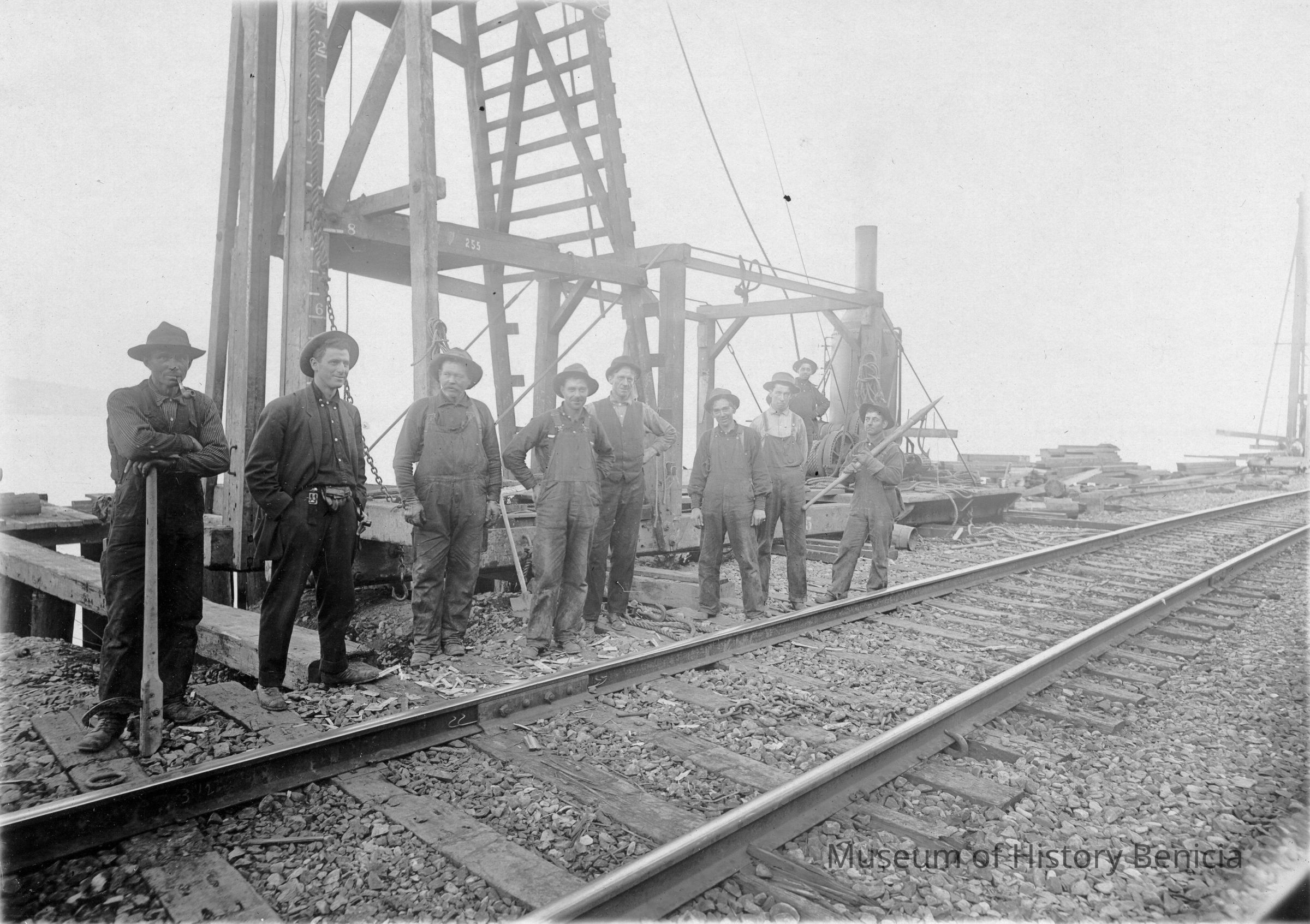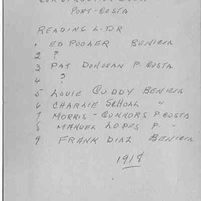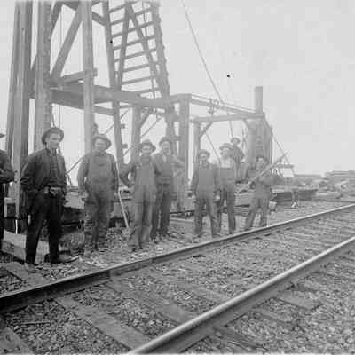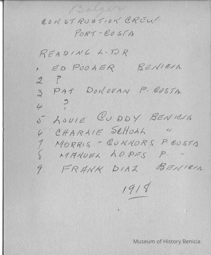 B&W photo of the men working railroad construction in Port Costa (per notation on back). Some of the men are named on the back.