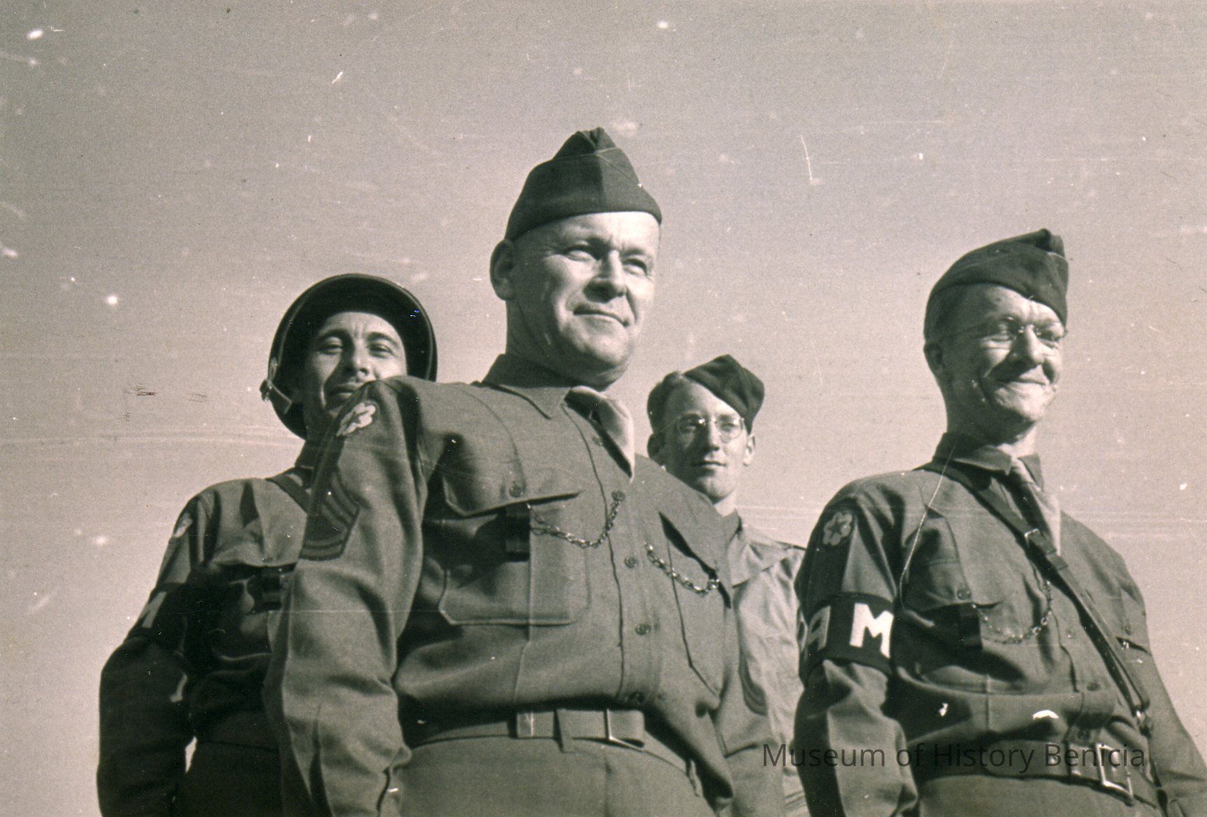 Four men in uniform, from low angle. Label on back: "1943. 1st Sgt. Rudy Quandt with three of his MPs who are about to go out and patrol the Arsenal." Reversed. B/W copy.Collection