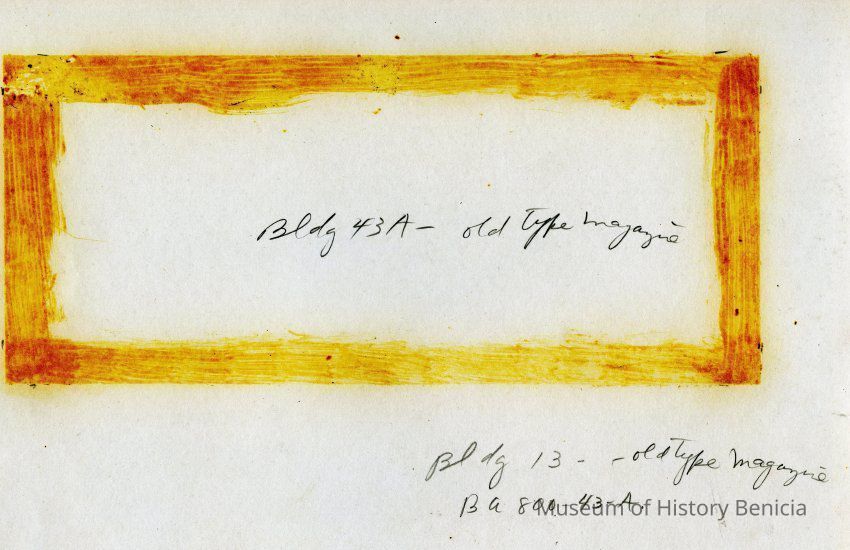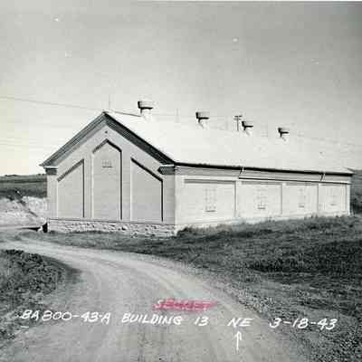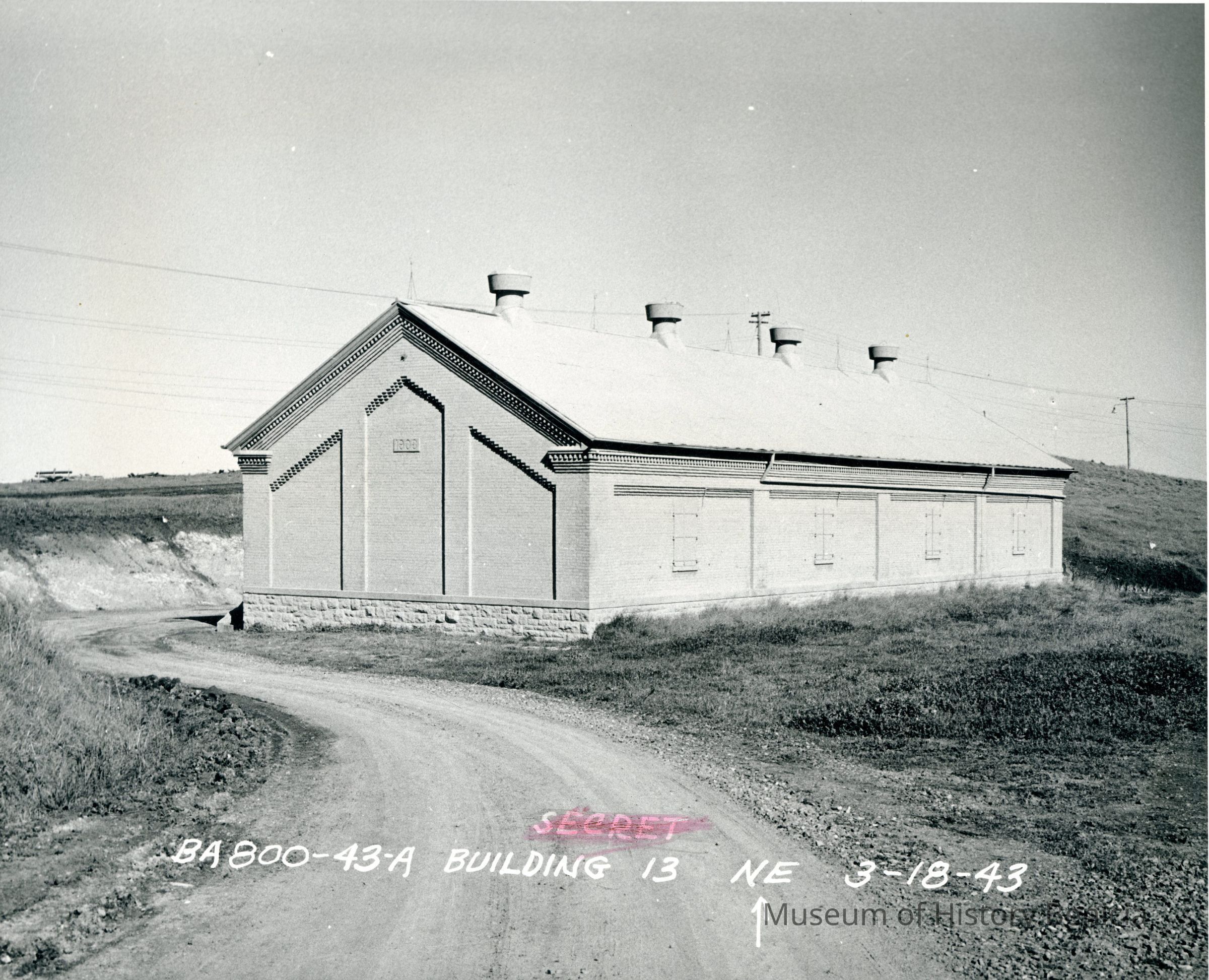 This is a photograph of building #13. It was built in 1903 and used as a magazine. The year on the building looks like 1903. The back of the photo says "Bldg 43A - old type magazine". It also says "Bldg 13 - old type magazine". At the bottom is written "BA 800-43-A".