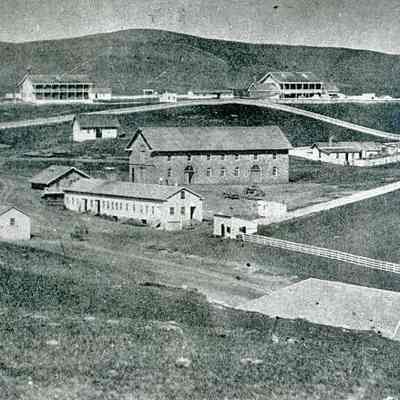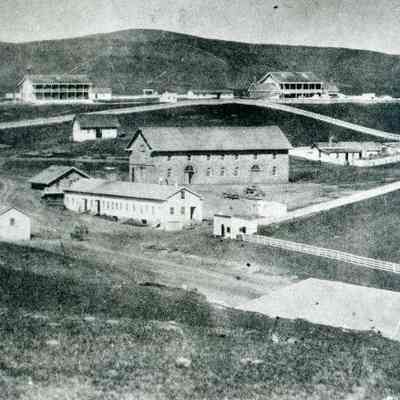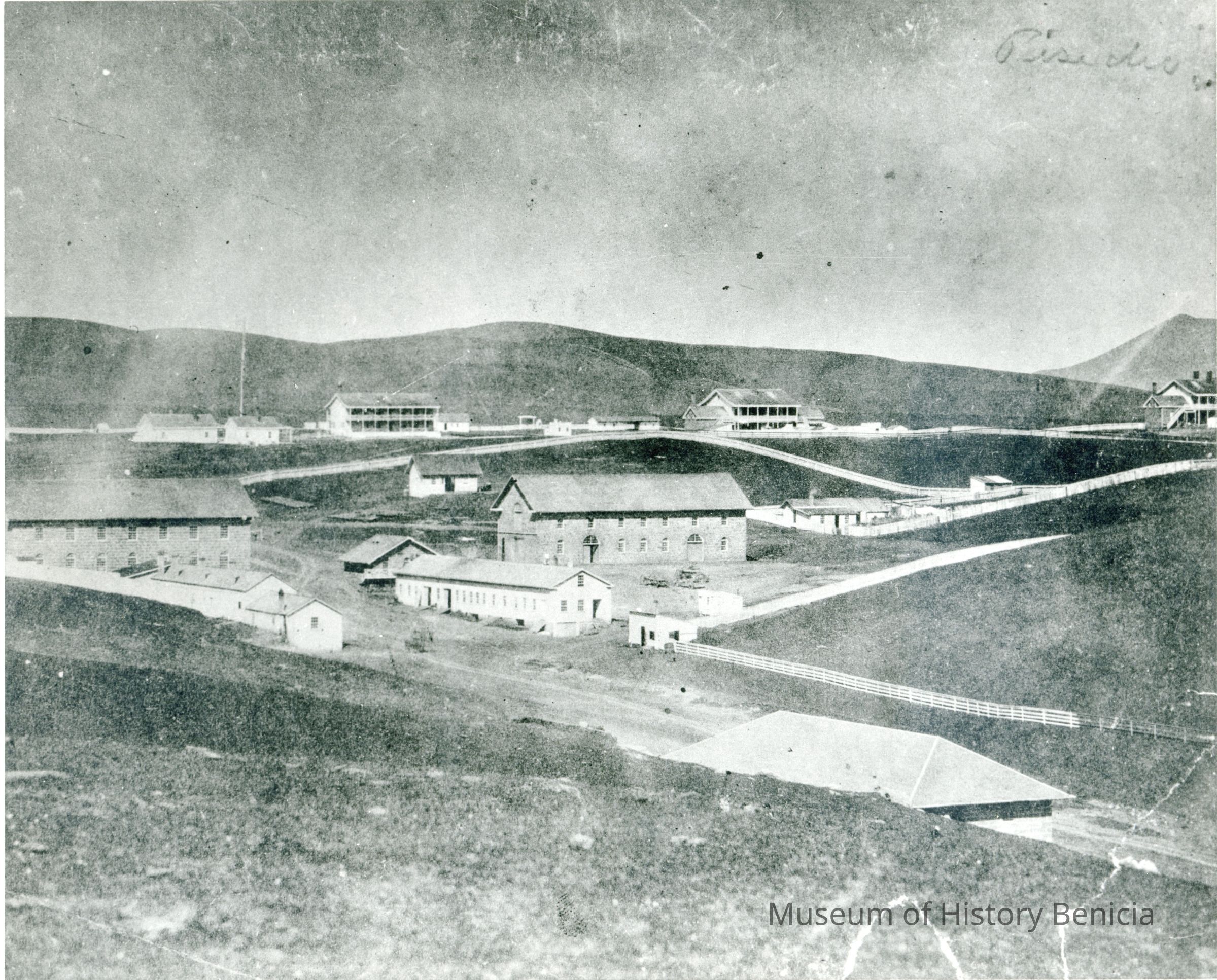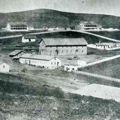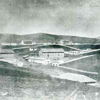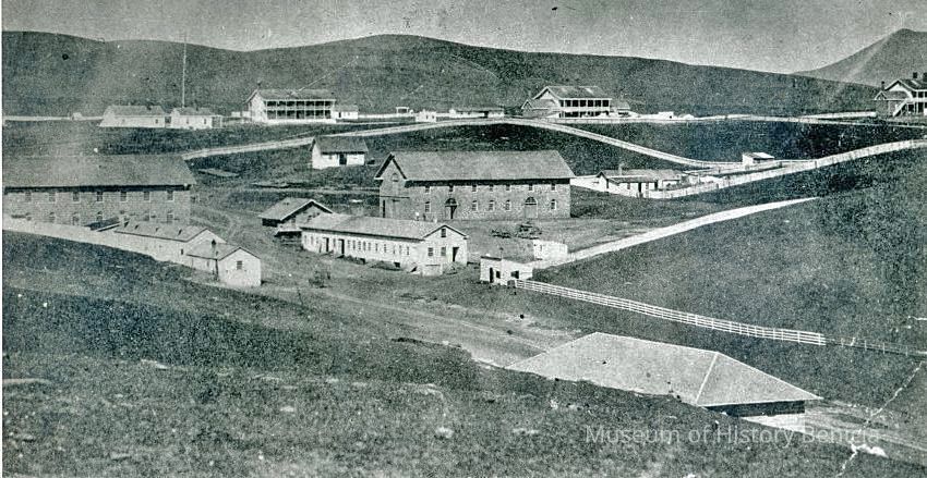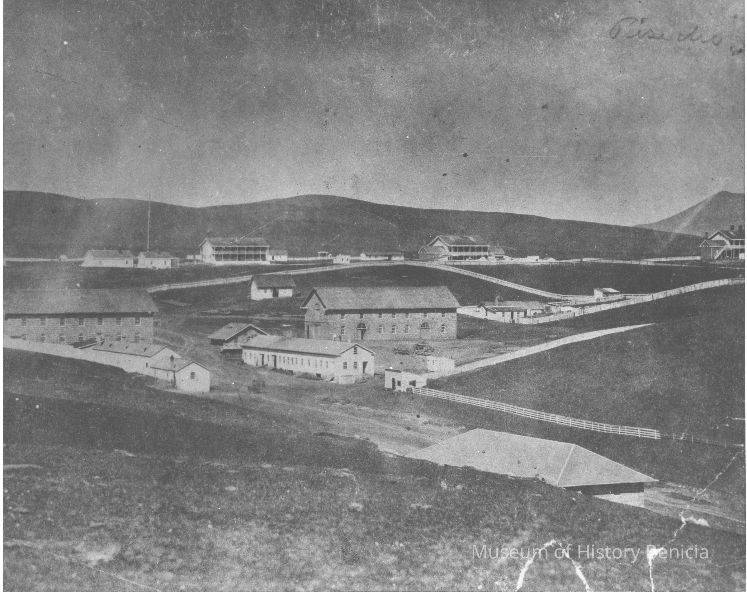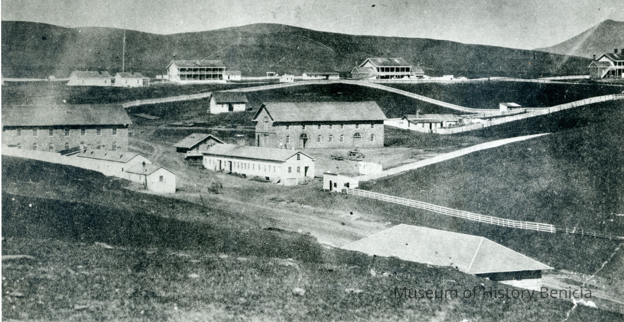 B/W photograph of Benicia Arsenal, Buildings 7 and 9 (Camel Barn) area in center, Benicia Barracks in background and Powder Magazine 10 in foreground (copy of original)Collection