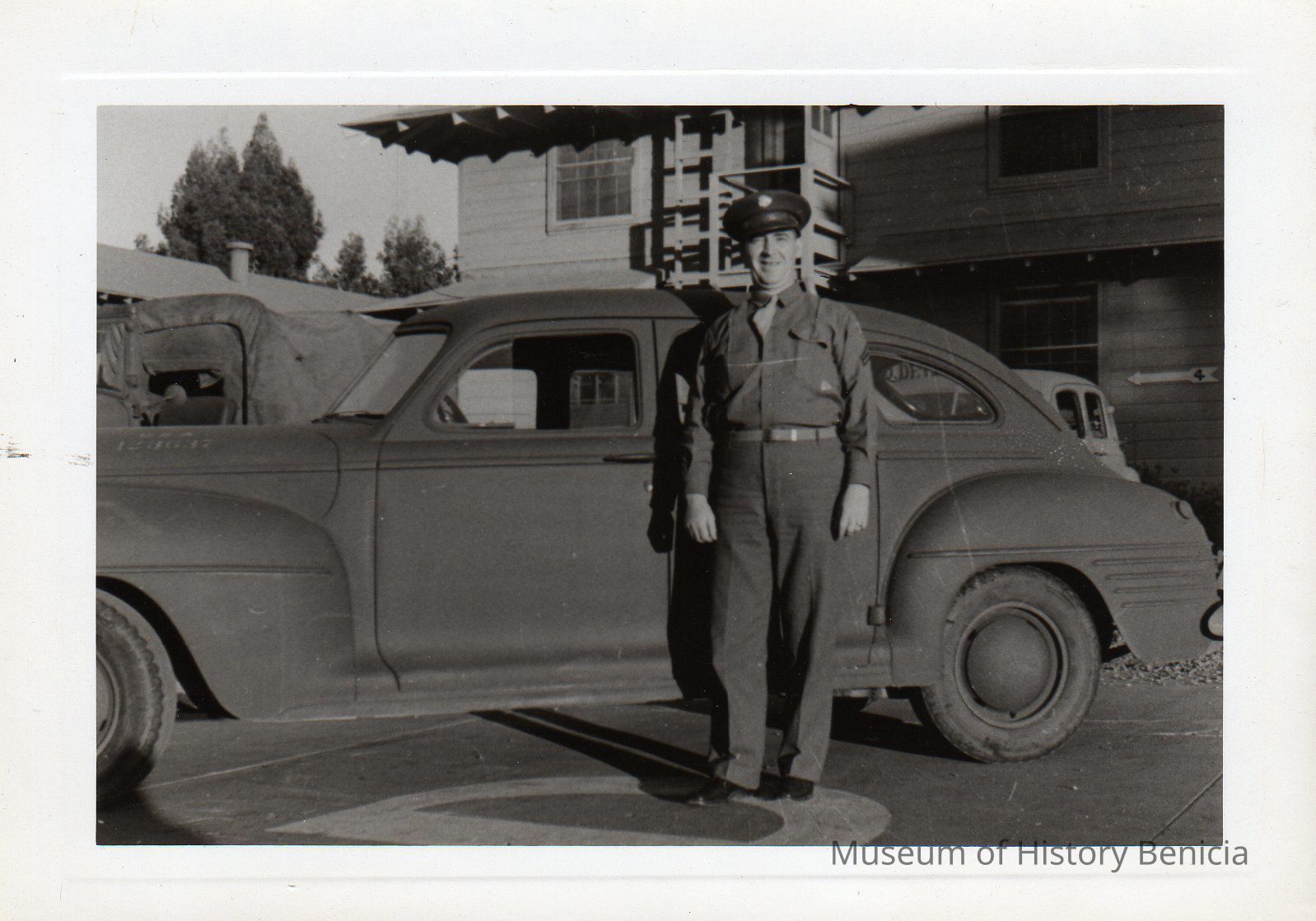 Man in uniform stands by car. "1943 Cpl. K J Broder, Colonel Paul Rutten's chauffeur, stands beside the Arsenal commander's personal staff car." B/W photo.Collection