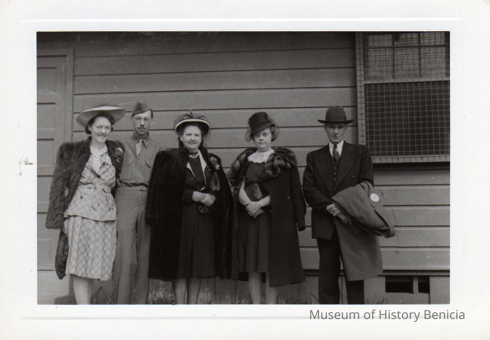 Three women and two men, one in uniform, stand outside building. Typed on the back "1943--Benicia Arsenal Headquarters Detachment Company Clerk Cpl. B. Robert Smout is visited by his wife and parents from New York." B/W photo.Collection