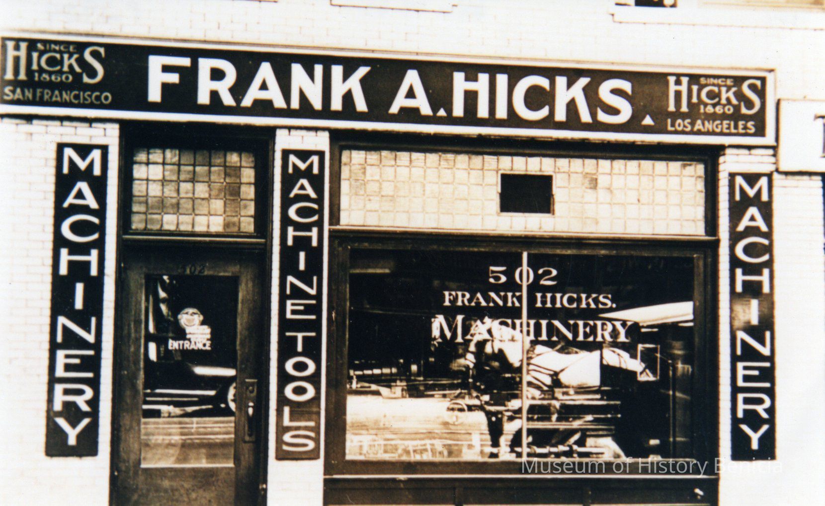 Copy of B/W photo of front view of "FRANK A. HICKS MACHINERY SHOP" with reflection of horse-drawn vehicle in window. 502 Howard Street. Donor is grandson of F.A. Hicks. Later Yuba Manufacturing manufactured the Hicks engine for boats and other large machines.Collection